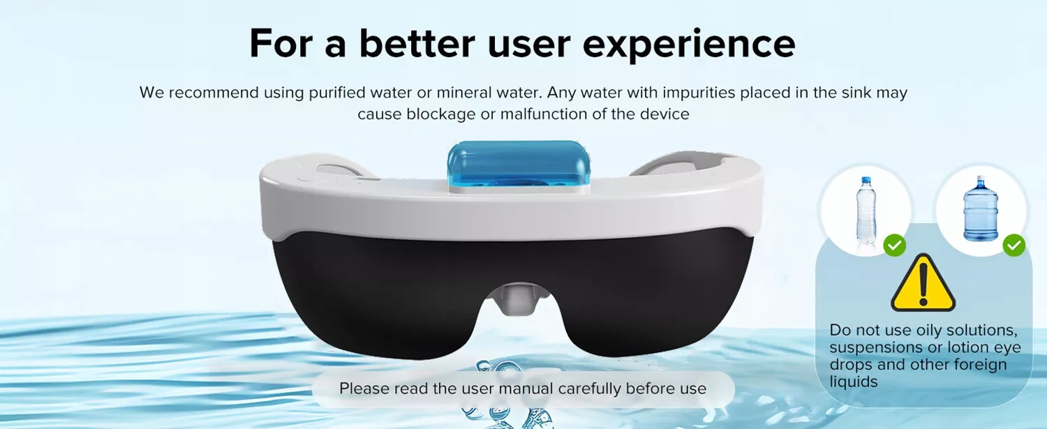 [Примечания перед использованием] Мы рекомендуем использовать для пропаривания глаз чистую или минеральную воду. маска для сна. Любая вода с примесями, попадающая в резервуар для воды, может привести к закупорке распылительной насадки. Перед использованием внимательно прочитайте руководство пользователя. Правильное использование этого устройства для массажа глаз обеспечивает оптимальное расслабление и увеличивает срок службы устройства. Если вы столкнулись с В ситуации, когда водяной туман образуется только из одного отверстия, снимите резервуар для воды, промойте внутреннюю часть резервуара чистой водой, переверните его и дайте ему высохнуть, прежде чем снова использовать его.