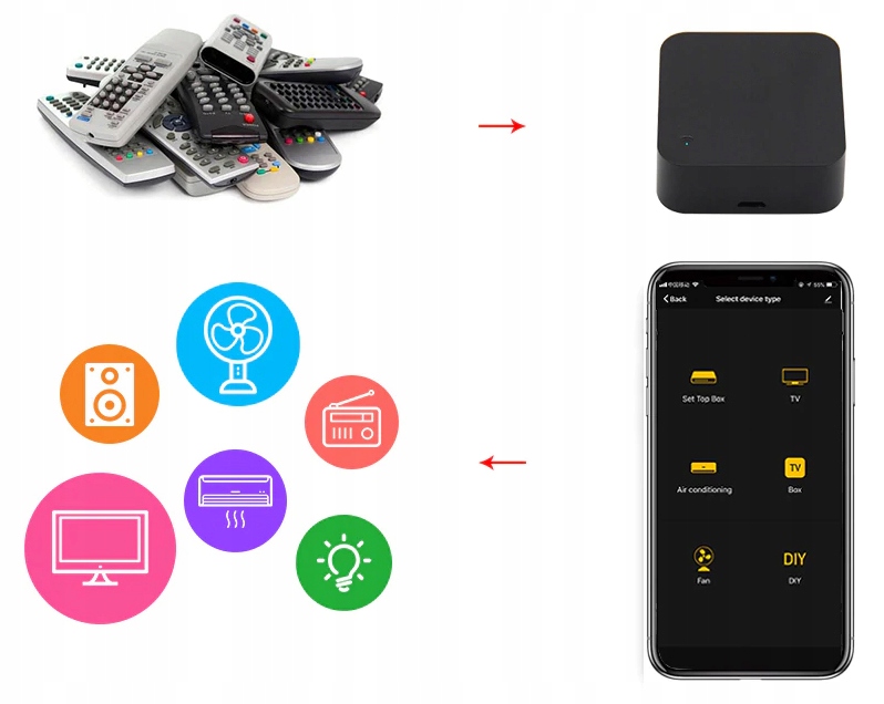 Это мини-интеллектуальное устройство WiFI, которое позволяет вам управлять всеми вашими домашними инфракрасными устройствами из любой точки мира, например, телевизором, спутниковым тюнером, домашний кинотеатр, DVD, кондиционер, вентилятор, радио, динамики, освещение и т. д. с помощью смартфона. Приложение Smart Life для вашего смартфона доступно на польском языке. Подключаем устройство к Интернету с помощью домашнего Wi-Fi роутера.