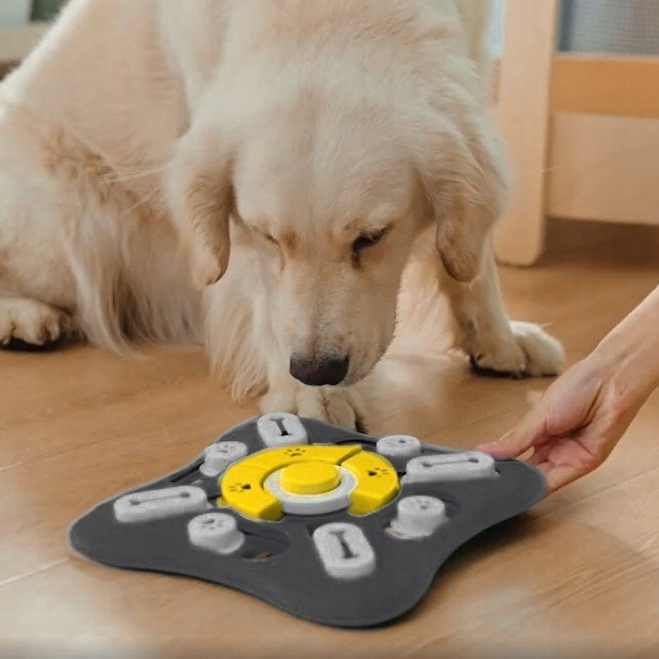 Создано специально для того, чтобы у собаки было время играть, большое количество отделений позволит собаке найти закуски в каждом отделении. Средняя головоломка вращается на 360 градусов, а кнопка издает приятный звук. Домашние животные могут добывать еду, открывая движущиеся части ртом или лапами. Это не только отличная миска для их кормления, но и для упражнений для мозга и взаимодействия.