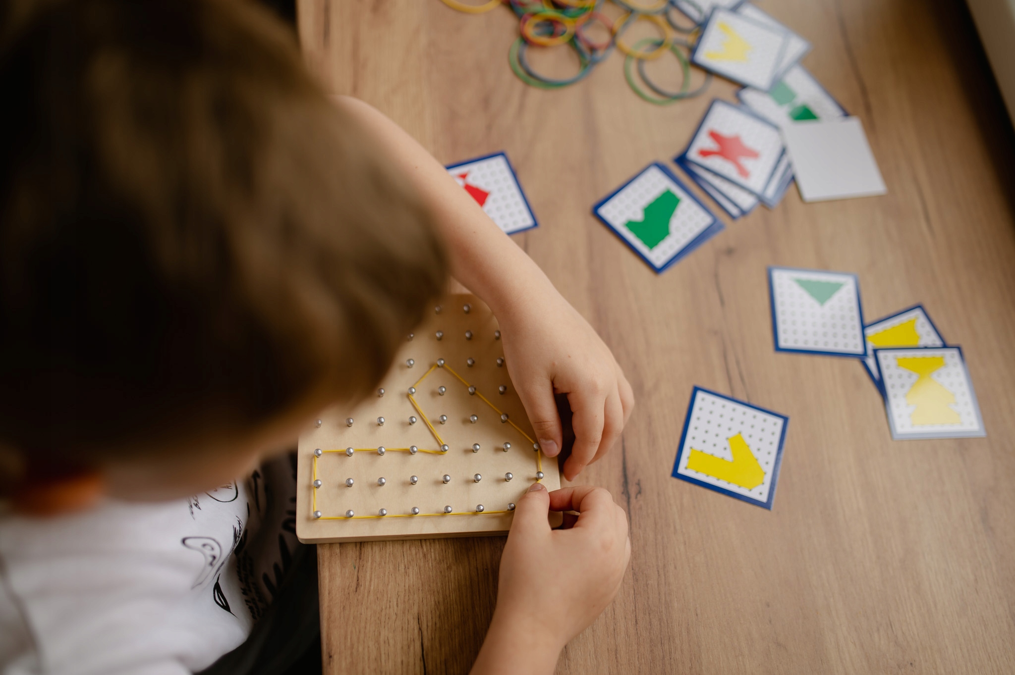 Просто нарисуйте одну карточку, которая представляет заданную форму, и с помощью резинок правильно зацепите ее за выступающие колышки, чтобы перенести на деревянная доска.