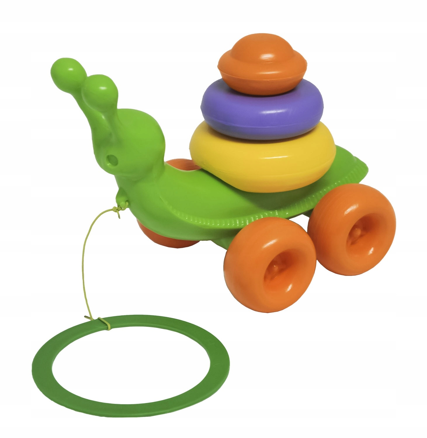 Игрушка состоит из основы на 4-х колесиках, составляющих тело улитки, и 3-х колец разного цвета, образующих ее домик. «Улитка» оснащена крючком на веревочке, чтобы ребенок мог тянуть ее за собой.