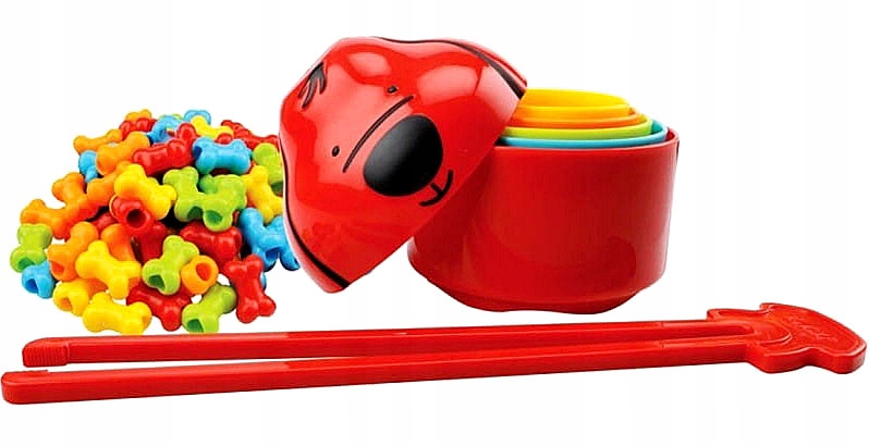 В набор входят несколько контейнеров разных цветов и размеров, щипцы и разноцветные кубики с отверстиями. Игрушка побуждает ребенка брать кубики палочками и раскладывать их по разноцветным мискам, как это можно делать двумя пальцами.