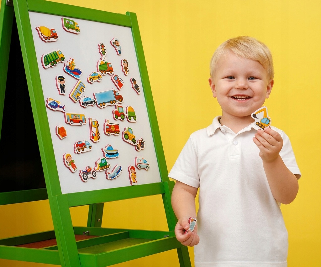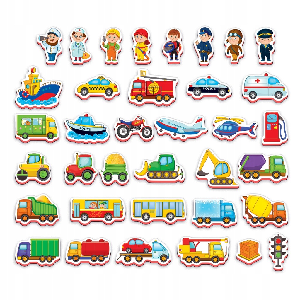 Тематический набор магнитов познакомит ребенка с различными видами транспорта.