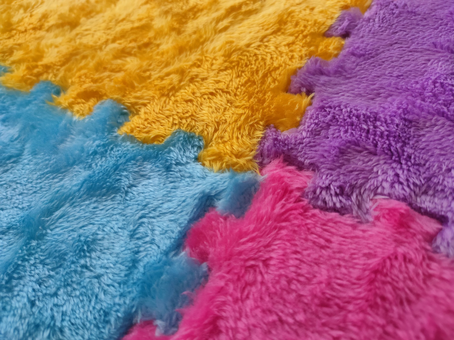 Особое внимание мы уделяем точному крою элементов. Пазлы должны плотно прилегать друг к другу, без необходимости применять силу или каким-либо образом загибать края. Ткань, из которой состоит ковер, представляет собой один элемент, встроенный в пенопласт. Благодаря этому мы можем быть уверены, что ковер не «полысеет» в процессе эксплуатации. Единственная ситуация, при которой волосы с ковра могут оказаться на полу, это сразу после распаковки — мы стараемся разрезать пазл так, чтобы срезать как можно меньше волос, но полностью избежать этого не можем. Вначале с пазла, срезанного в процессе вырезания пазла, может выпадать небольшое количество волос, непосредственно в местах его стыков. В коричневом пенопласте также могут быть небольшие пузырьки воздуха, это нормально для прочного пенопласта ЭВА, из которого изготовлены пазлы.