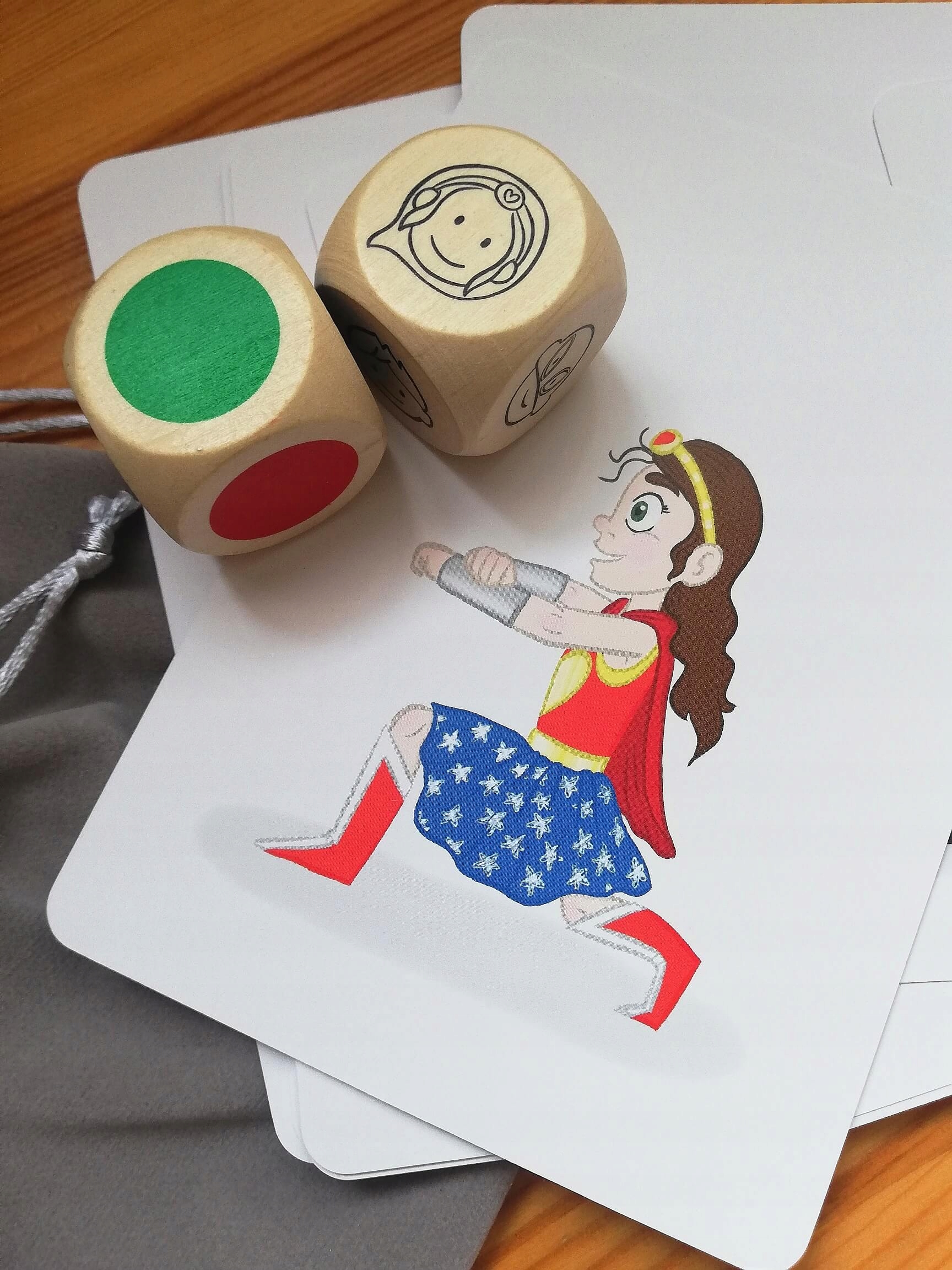 - 18 карточек супергероев. У каждого супергероя есть три отдельные карты красного, синего и зеленого цвета соответственно,