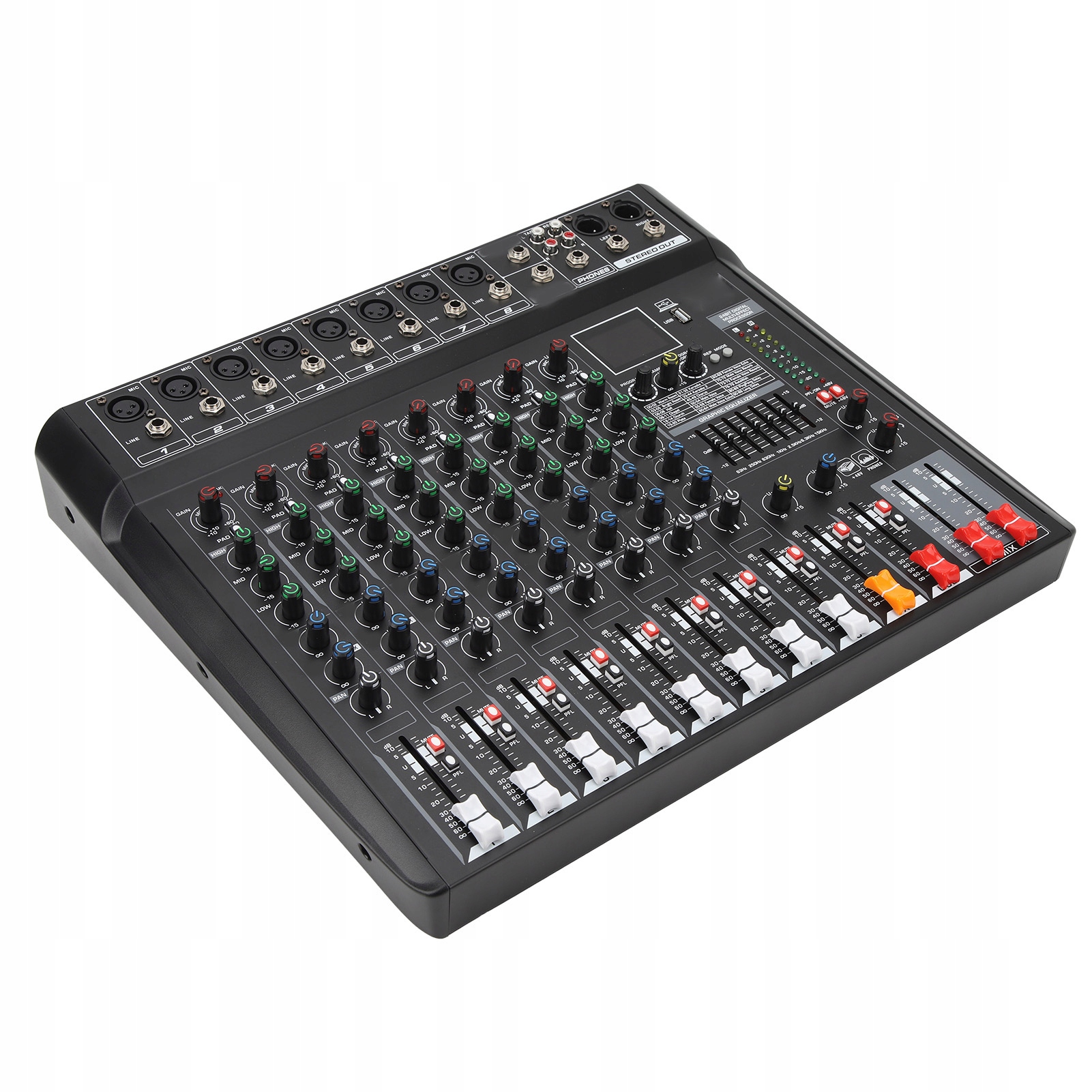 1. Богатые входные и выходные интерфейсы: 8-канальный звуковой микшер имеет богатые входные и выходные интерфейсы, к которым можно подключить различные звуковые устройства, проводные или беспроводные микрофоны, электронную клавиатуру, компьютеры, усилители мощности, динамики и т. д. 2 Беспроводное соединение Bluetooth : Аудиомикшерный пульт RS8 подключается по беспроводному каналу Bluetooth, обеспечивая стабильное и удобное качество передачи звука. 3.99 Эффекты реверберации: на микшерной консоли доступно 99 типов элементов управления реверберацией, что позволяет в любой момент настроить эффект, необходимый для сцены. 4. Экран дисплея: цветной ЖК-дисплей, понятный рабочий интерфейс, свободное управление использованием различных эффектов. 5. Функция мониторинга в реальном времени: подключите наушники для мониторинга сигналов уровня каждого канала в режиме реального времени.