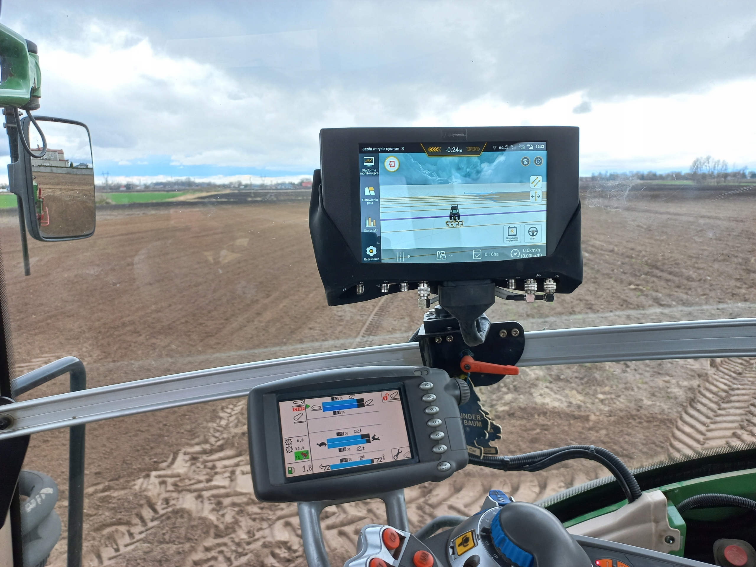 <р>1. Модуль из двух GNSS/GPS антенн - позволяет двигаться на автопилоте на малых скоростях от 0,8 км/ч. <р>2. Магнитный датчик - измеряет угол поворота колес. <р>3. Электрический привод руля – бесщеточный инверторный двигатель с крутящим моментом 10-20Нм способен поворачивать руль с большим сопротивлением. <р>4. Инерциальный модуль (ИМУ) – позволяет максимально точно ориентироваться при движении по наклонной местности. <р>5. Навигационный терминал - сенсорный экран 25,7 см с приложением на польском языке и поддержкой стандарта ISOBUSТЕХНИЧЕСКИЕ ХАРАКТЕРИСТИКИ: