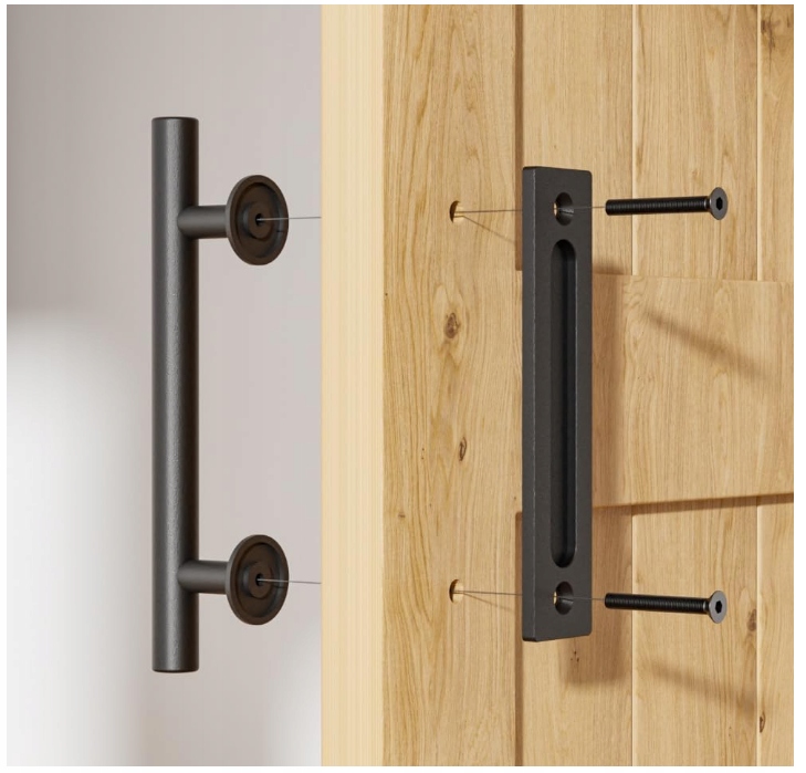 Комплект двухсторонний для РАЗДВИЖНЫХ ДВЕРЕЙ с одной стороны сплошная ручка (захват) для надежного закрытия дверного полотна, с другой ручка с утопленной в дверь табличкой. Металлическая конструкция с черным порошковым покрытием обеспечивает стойкость к царапинам и эстетическую отделку, соответствующую стилю лофт. Решение хорошо работает в деревянных столярных изделиях: раздвижных дверях, традиционных распашных дверях и воротах. Установка проста и крепится винтами; В комплект входят крепежные винты.