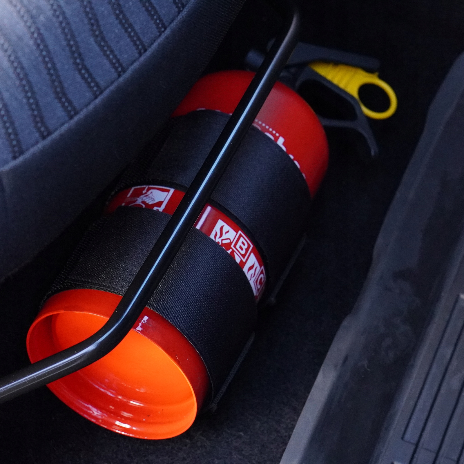 Удобная липучка для крепления автомобильного огнетушителя. Благодаря использованию резинки и большой липучки размещенный внутри огнетушитель не перемещается.