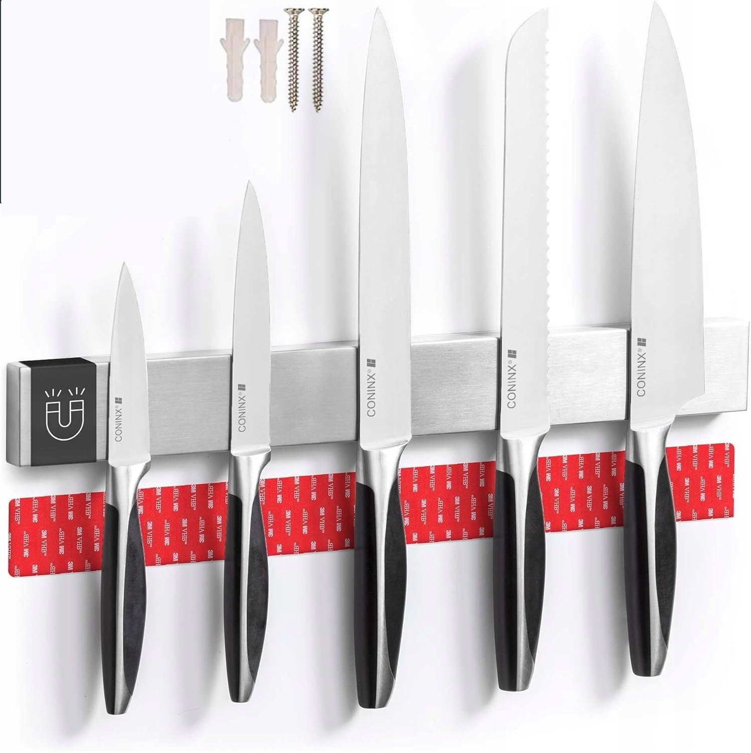 Безопасность является наиболее важной: наша практическая полоса для ножей оснащена чрезвычайно сильным магнитом. Вы можете прикрепить к нему еще большие и тяжелые ножи и повесить их полностью безопасно.