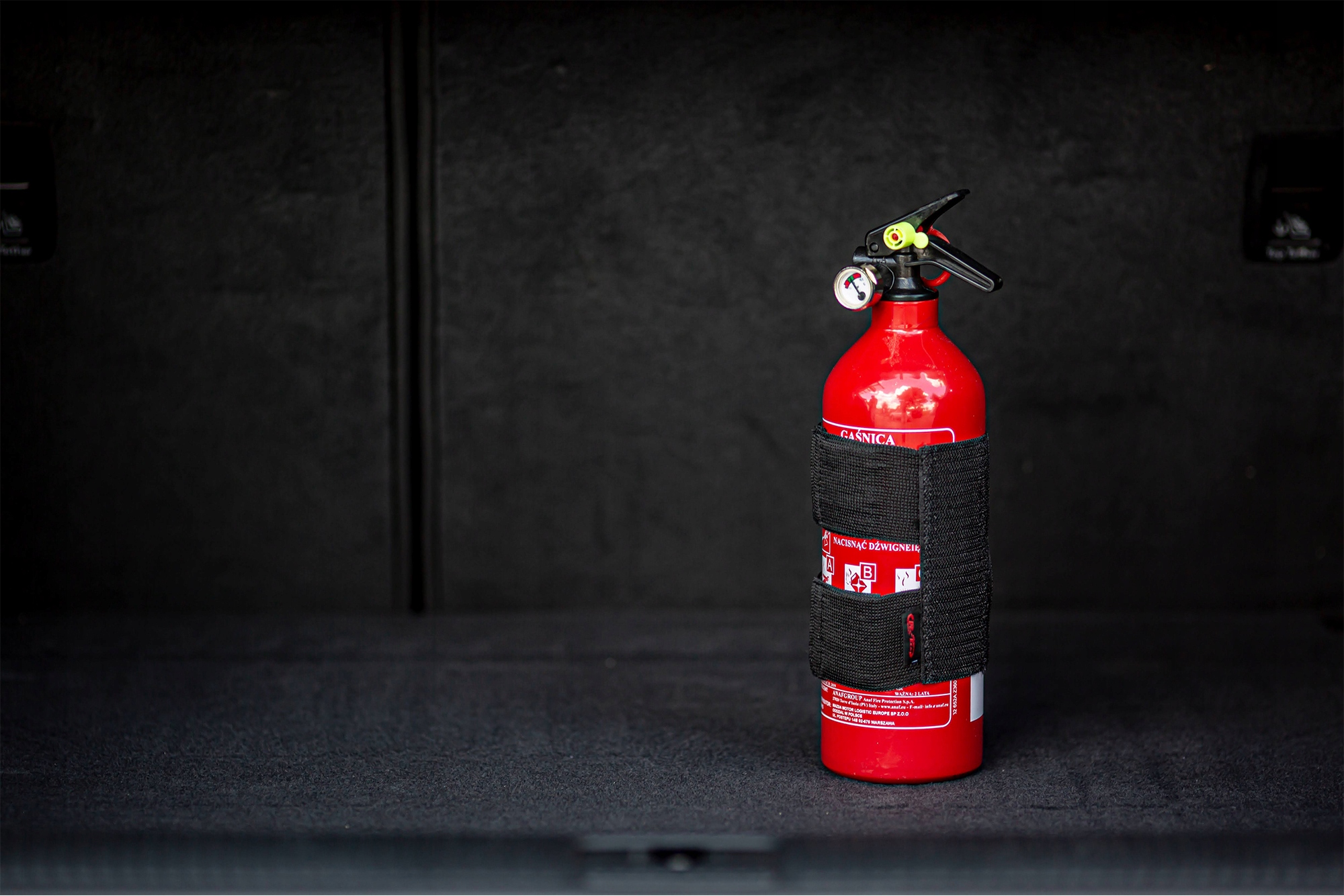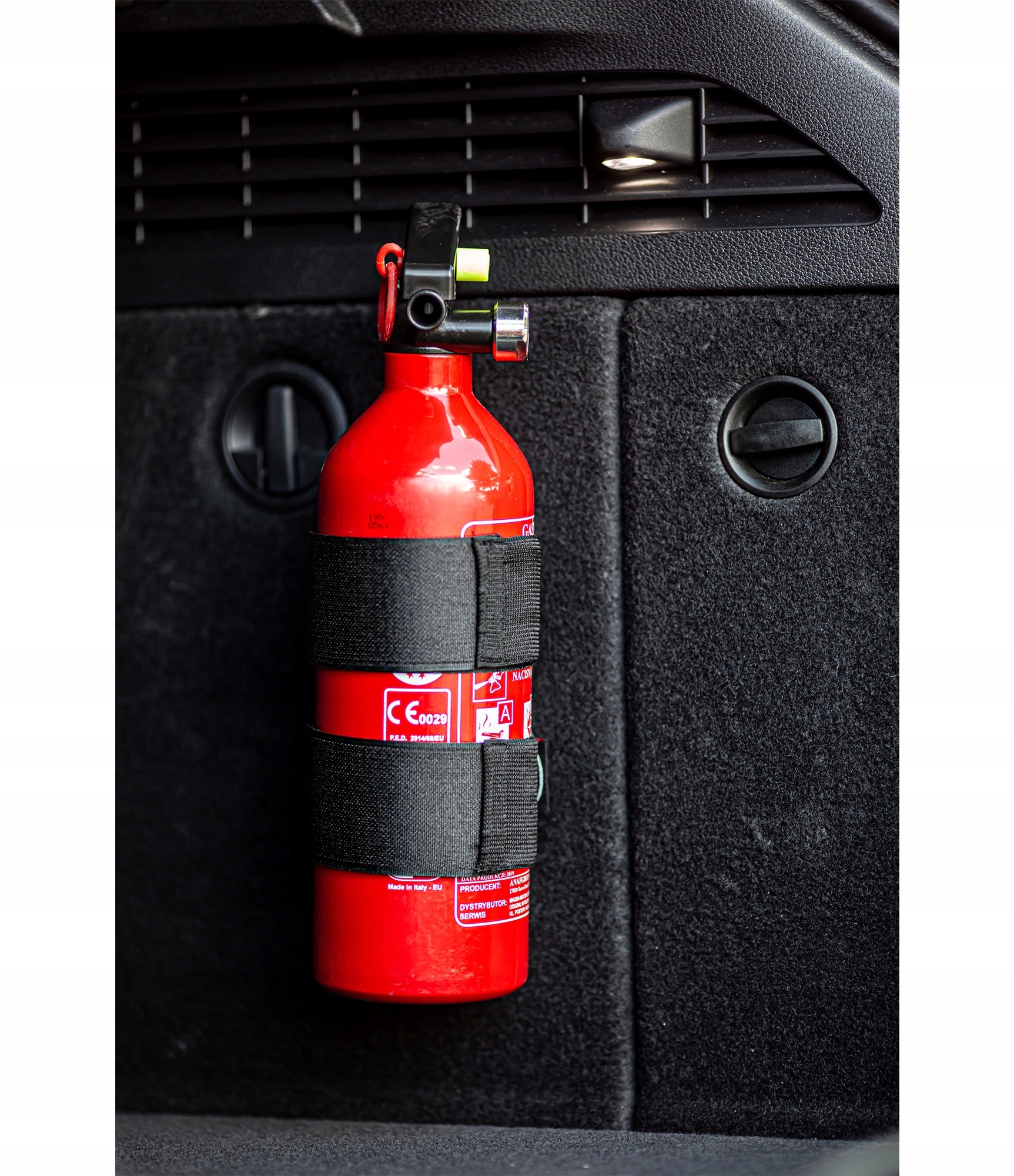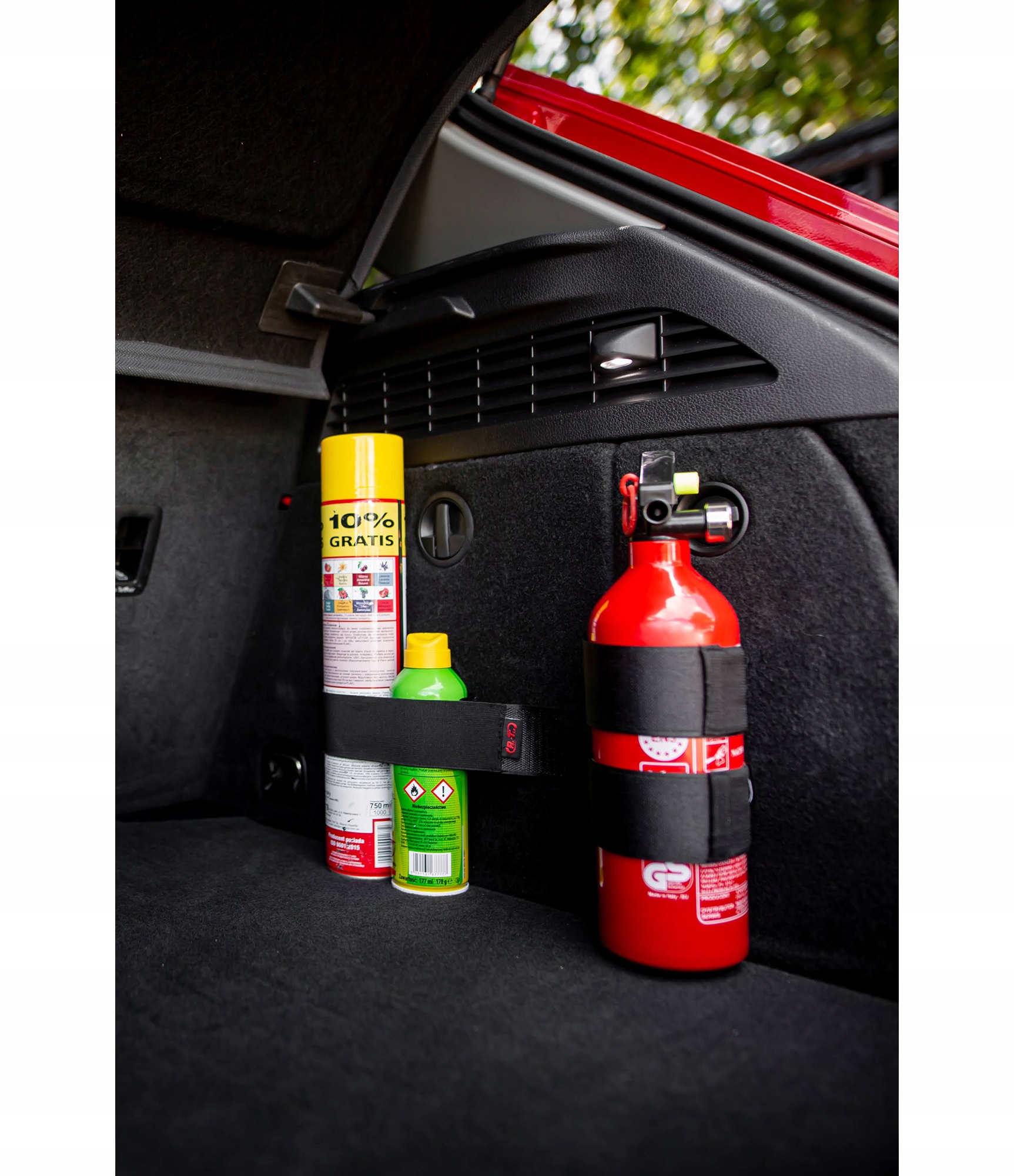 Ручка имеет прочную застежку-липучку, которая идеально прилегает к внутренней части багажника, коврик которого восприимчив к застежке-липучке. Эластичная манжета обеспечивает идеальное прилегание держателя к огнетушителю, благодаря чему он прочно прилегает к ленте без возможности выскальзывания.