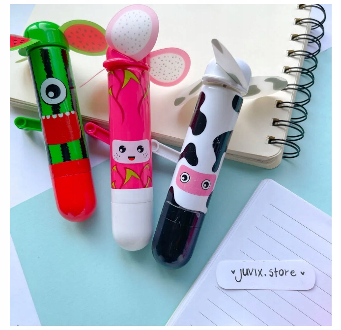Разноцветные вертушки - ручки. Если вам слишком жарко, просто поверните рукоятку, и через мгновение вы почувствуете прохладный ветерок. Однако, если вам нужна ручка, просто откройте колпачок и разверните ручку. Ручка-вертушка доступна в нескольких цветах: арбуз, личи, оранжевый, салатовый, синий и фиолетовый. Помните, что имеет значение, в какую сторону вы поворачиваете вентилятор. Если вы не чувствуете прохладного воздуха, поверните рукоятку в другую сторону.
