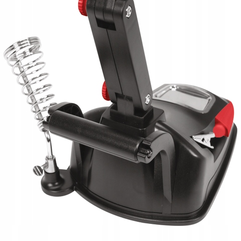 Третья ручка с кольцевой подсветкой из 10 светодиодов. Двойная лупа – большая, диаметром 75 мм, обеспечивает увеличение в 3 раза, меньшая встроенная лупа, диаметром 20 мм, увеличивает изображение в 4,5 раза. Вращающийся на 360 градусов рычаг с регулировкой угла в трех местах позволяет свободно работать как в зоне вспомогательных зажимов, так и за ее пределами. Два зажима типа «крокодил», установленные на подвижных рычагах, и двойные шаровые шарниры обеспечивают широкие возможности адаптации зажимов как к мелким украшениям, так и к небольшим печатным платам. Подставка для паяльной губки, гнездо для паяльника, ролик для крепления паяльной связки и отделение для хранения, например, винтов от разборки, помогают в организации работы.