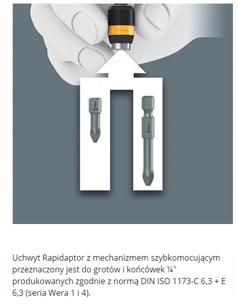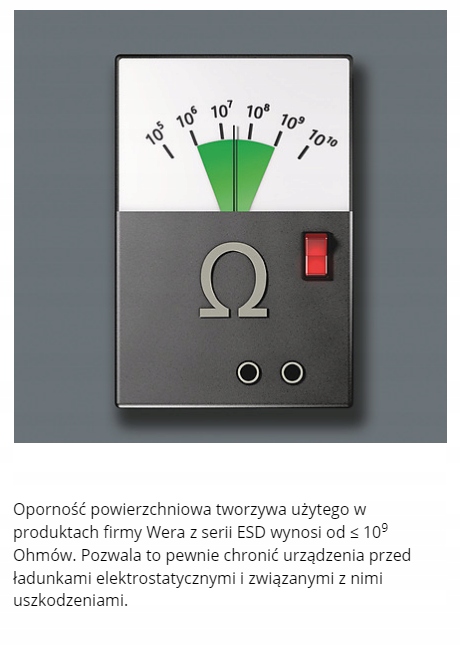 Высококачественная антистатическая ручка для работы без риска повреждения электростатическими зарядами: поверхностное сопротивление материала, используемого в изделиях серии Wera ESD, составляет 10^6 – 109 Ом. Это позволяет надежно защитить устройства от электростатических зарядов и связанных с ними повреждений. Быстросъемный держатель Rapidaptor позволяет быстро менять насадки и насадки без дополнительных инструментов. Ручка Kraftform обеспечивает приятную и эргономичную работу, защищая руки от волдырей и мозолей. Жесткие зоны захвата обеспечивают быстрое вращение, мягкие обеспечивают передачу высоких крутящих моментов. Для шестигранных бит 1/4" согласно DIN ISO 1173-C 6,3 и бит E 6,3 (ISO 1173).