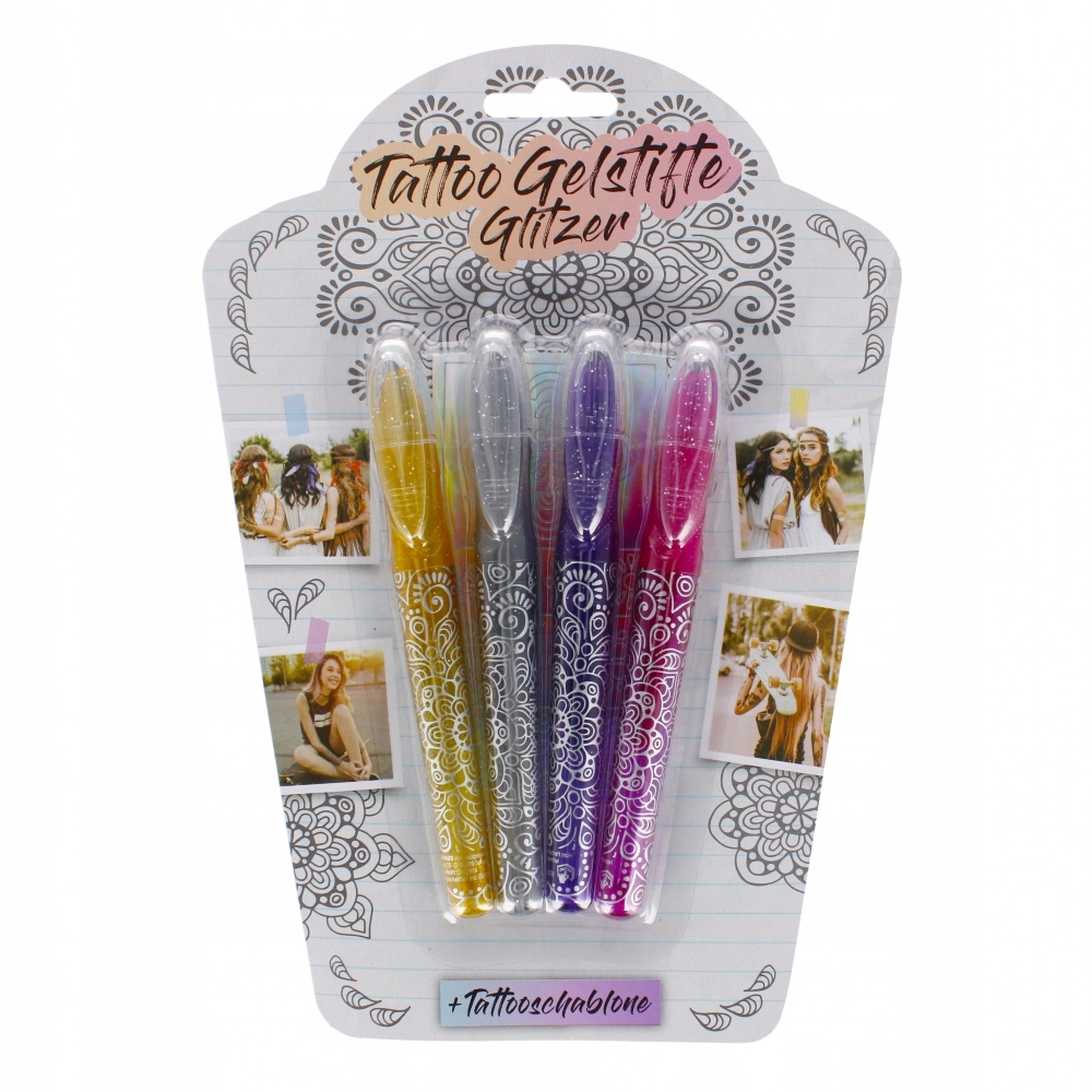 Проявите творческий подход! В этот набор входят 4 блестящие гелевые ручки и трафарет для татуировок, с помощью которых вы сможете создавать красивые рисунки на коже. Мотивы на трафарете для тату также можно комбинировать с собственными творческими идеями. Татуировки легко удаляются путем многократного мытья с мылом. А для более креативных идей прекрасно подойдут гелевые ручки для декора и рисования на бумаге. В наборе: 4 гелевые ручки для татуировок с блестками (серебряные, золотые, розовые, фиолетовые), 1 трафарет для татуировок.