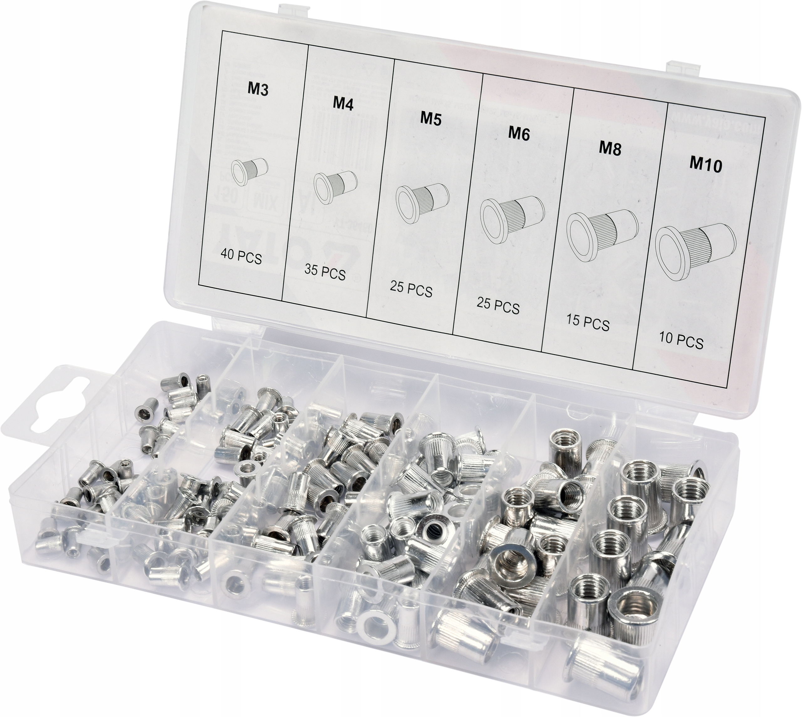 В комплект входит набор алюминиевых заклепок-гаекМ3 - М10 - 150 штук.