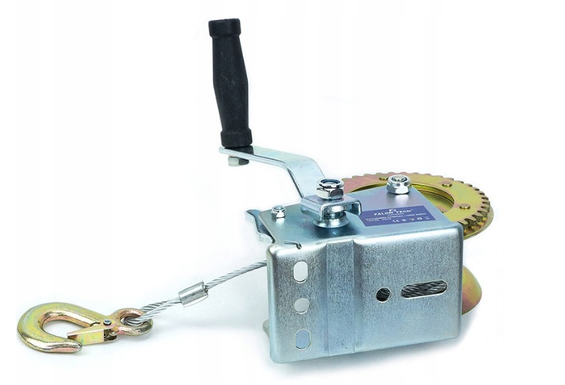 - Изготовлена из прочного материала. стальной трос и рычаг, приводящий в движение барабан с храповым механизмом.