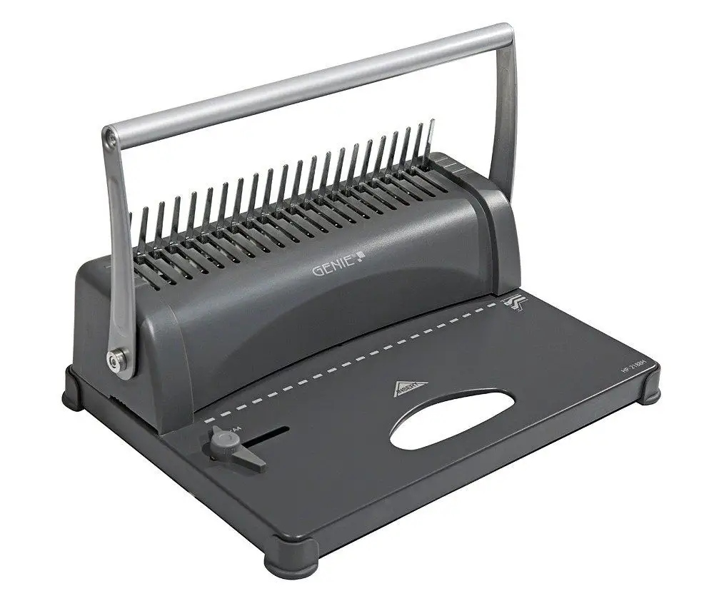 Переплетная машина — одно из устройств, которое не должно отсутствовать в хорошо оборудованном офисе. Это устройство должно быть прочным, эффективным и спроектировано так, чтобы оно не заклинивало и оставалось полностью функциональным независимо от времени и интенсивности использования, а его работа не вызывала проблем. Переплетная машина немецкой марки GENIE отвечает всем этим характеристикам. Он изготовлен из высококачественных материалов и с использованием проверенных, эффективных решений. Это устройство очень универсально – оно способно переплетать до 350 листов бумаги формата А4. Эта превосходнаяпереплётная машина формата А4 готова к использованию практически сразу из коробки, так как в комплект входит переплетный набор из 75 предметов, в который входят спирали и обложки разных размеров, в том числе несколько декоративных, похожих на кожу. Устройство оснащено дыроколом, что делает его еще более функциональным.