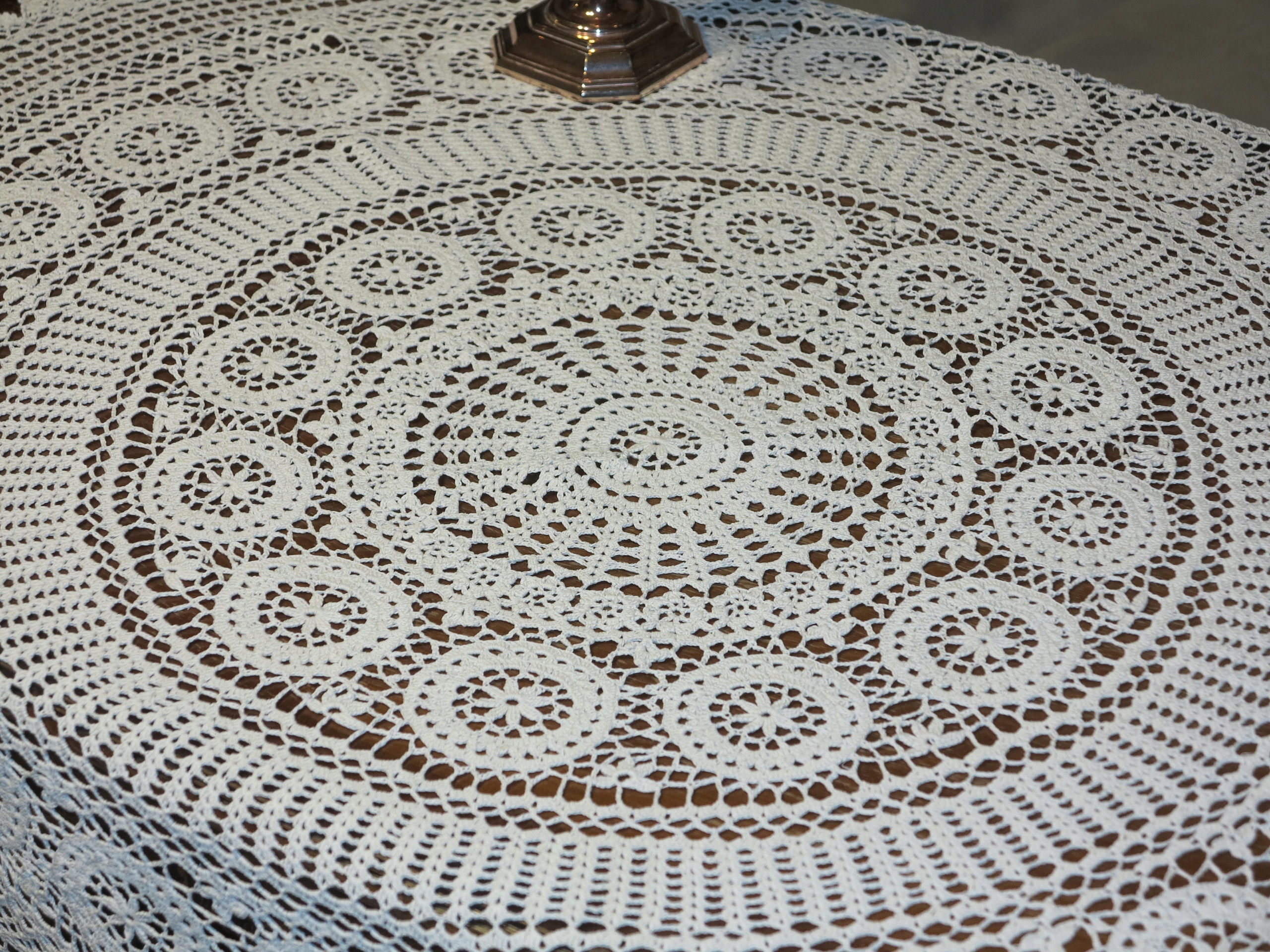 РУЧНА ПРОДУКЦІЯ - ГАРНА СУЦІЛЬНА СКАТЕРТИНА КРУГЛА КОРОНА, РОЗЕТКИ, БЕЖЕВА 122см