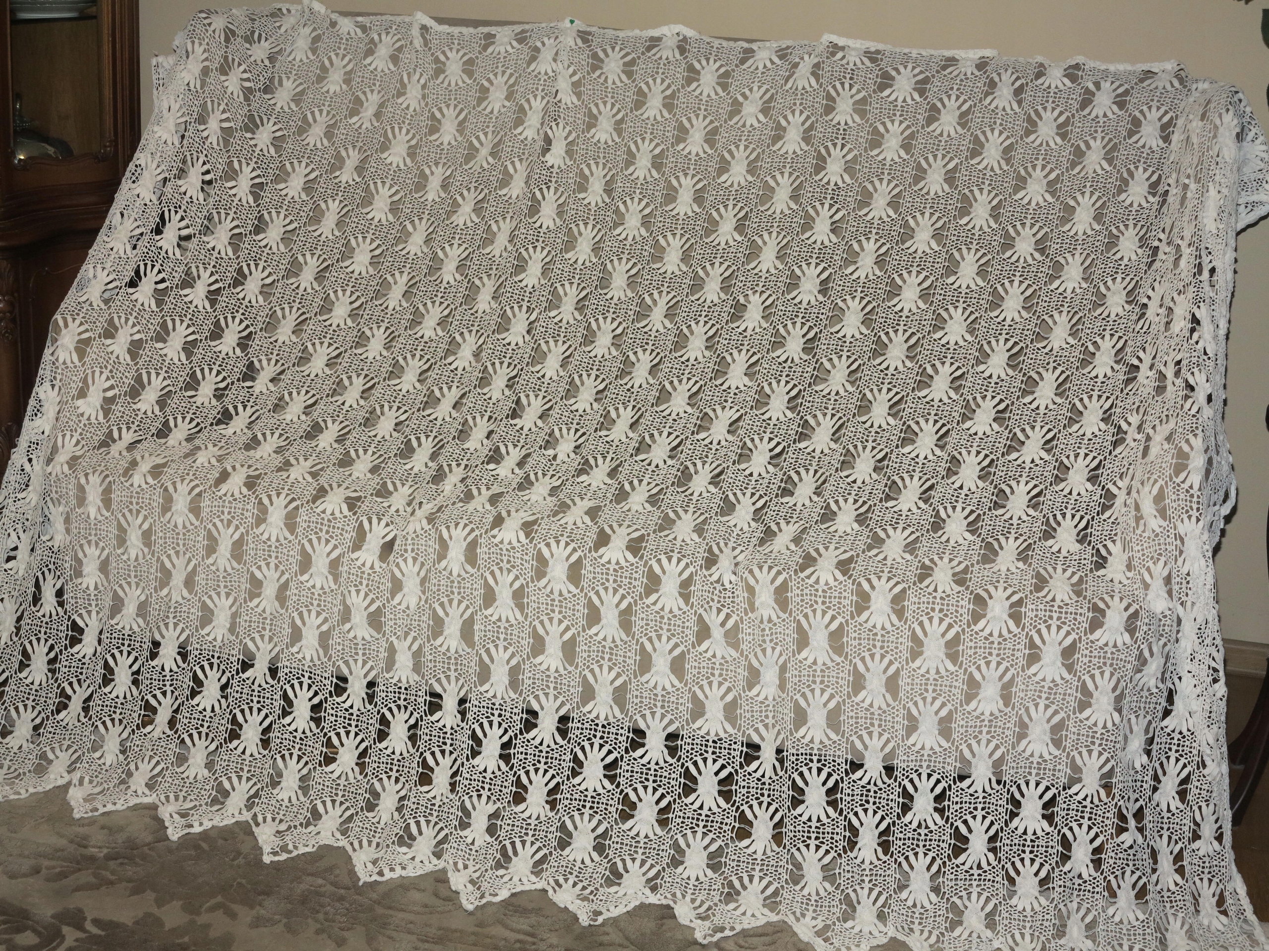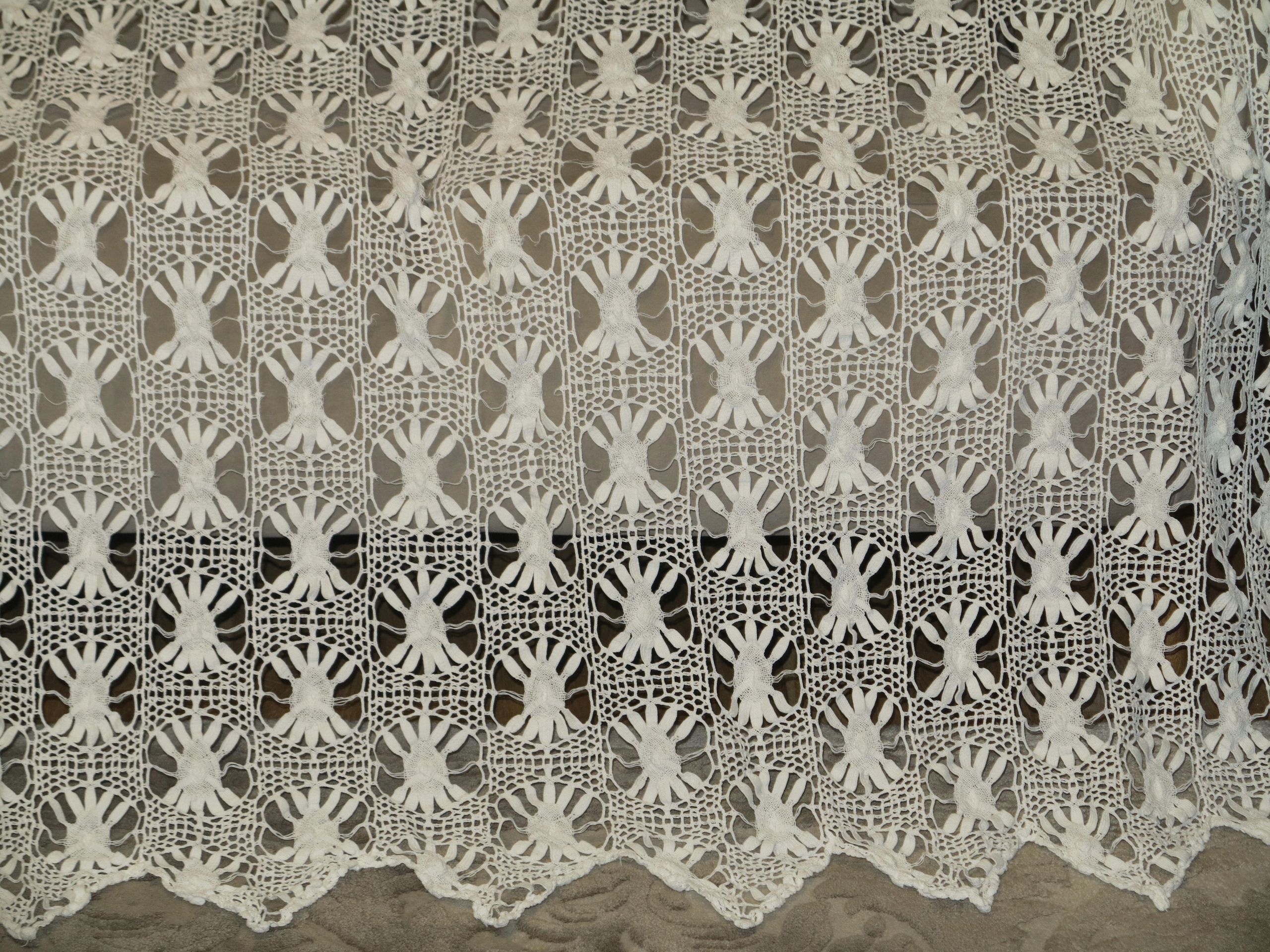 ОЧЕНЬ КРАСИВУЮ, ПОЛНОСТЬЮ РУЧНОЙ РАБОТЫ СНЕЖНО-БЕЛУЮ КОРОННУЮ ШТОРУ. ШТОРА С БОЛЬШИМИ ЗУБЦАМИ ВНИЗУ, ИЗ ХЛОПКОВОЙ НИТИ, ОЧЕНЬ ИНТЕНСИВНО СДЕЛАННАЯ ТОНКИМ ВЯЗАНИЕМ КРЮЧКОМ