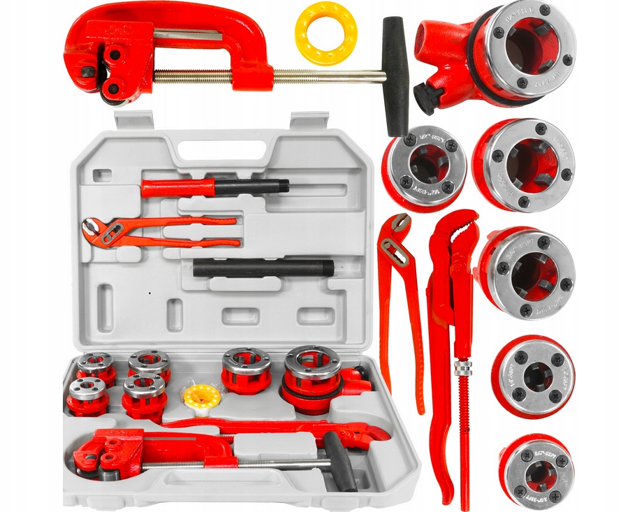 Наличие двух гидроключей и трубореза существенно расширяет функциональные возможности набора. Ключи позволяют стабильно удерживать и обрабатывать трубы, что облегчает наведение матрицы и исключает риск вращения материала. Труборез позволяет подготовить идеально прямой и чистый край, что очень важно перед началом нарезания резьбы. Этот набор инструментов дает пользователю доступ к полноценному мастер-классу в одном чемодане.