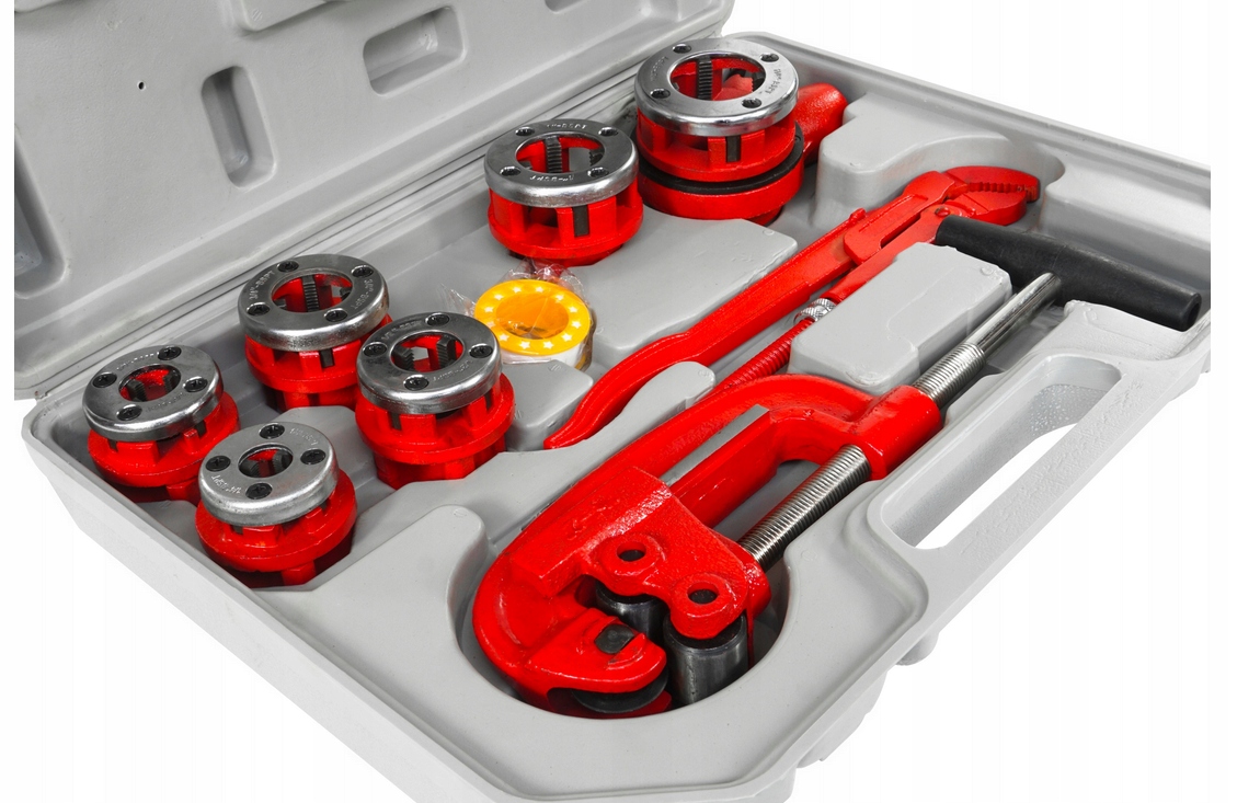 Благодаря одинаковому креплению всех головок, быстродействующей собачке и прочной чугунной конструкции нарезание резьбы происходит быстро, эффективно и плавно – независимо от диаметра обрабатываемой трубы. Дополнительно в комплект входят труборез, 2 гидравлических ключа и тефлоновая лента, что делает этот набор исключительно функциональным и готовым к работе сразу после извлечения его из чемодана.