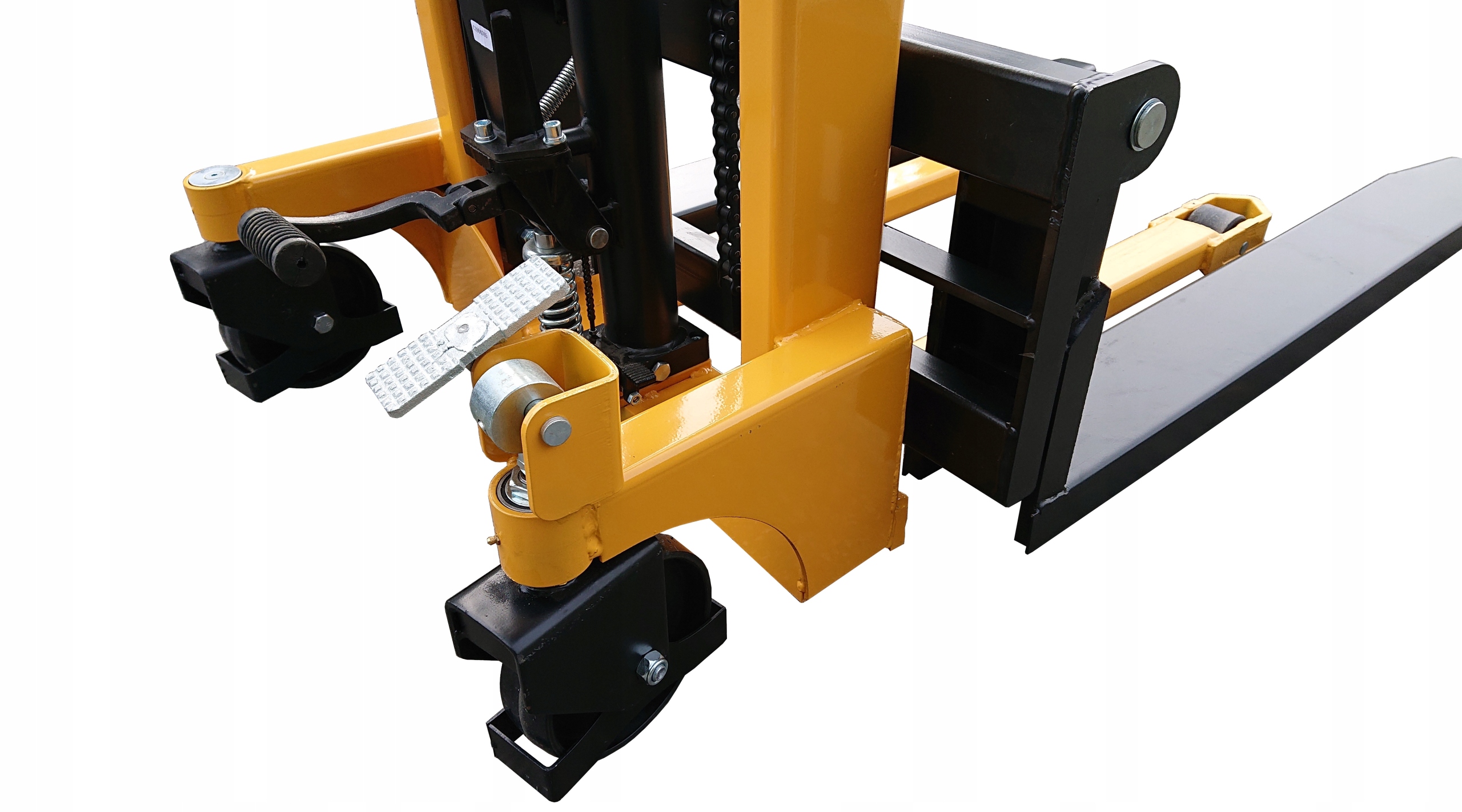 НОВЫЙ ручной мачтовый погрузчик. Прочный, простой и надежный. Гидравлический подъем осуществляется с помощью ручного рычага или ножной педали, плавное опускание груза осуществляется нажатием рычага на рулевой ручке. Специально разработанная стальная конструкция повышает стабильность и безопасность. Подъемный рычаг с резиновым покрытием. Стояночный тормоз