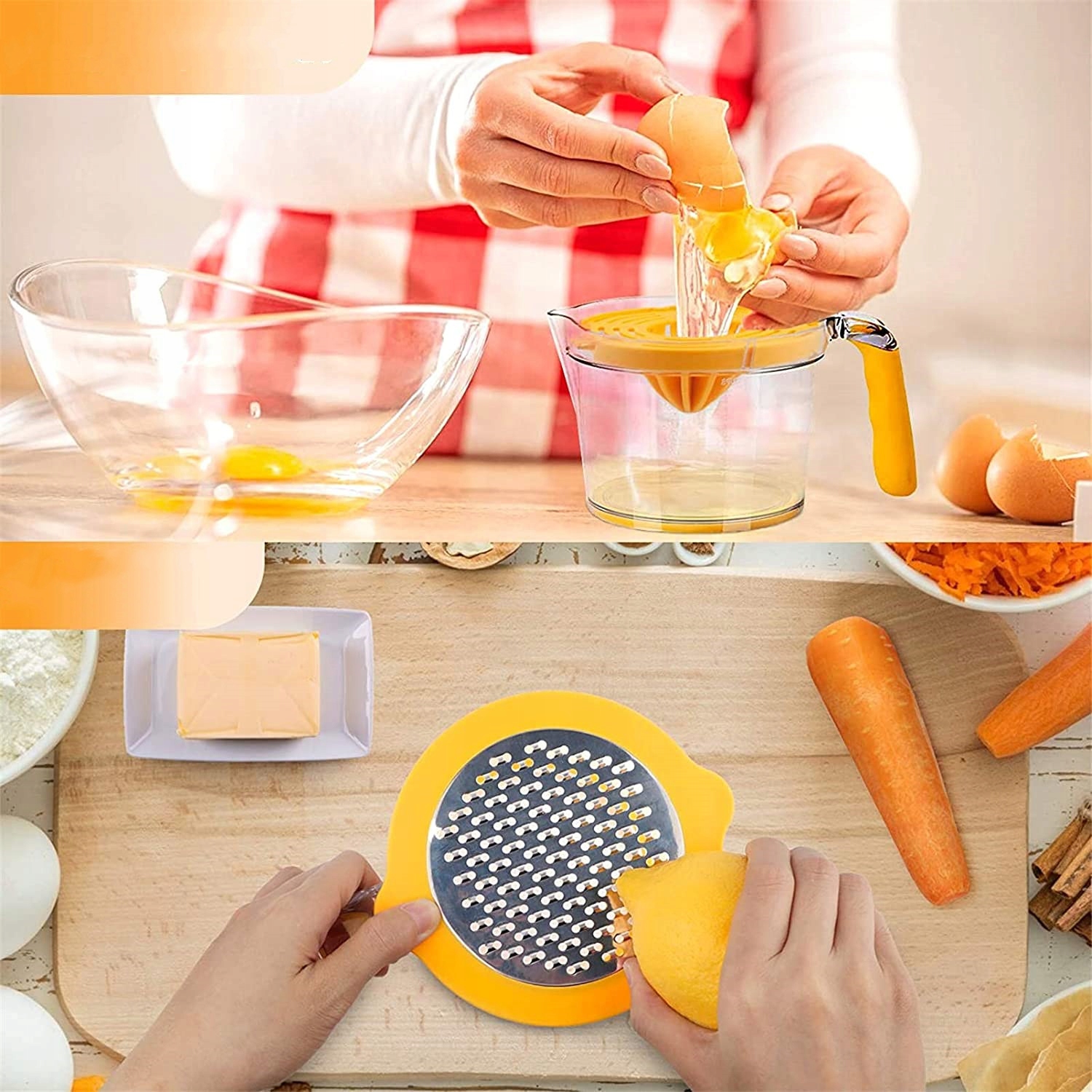 Ручная соковыжималка для лимона и апельсинов имеет новую конструкцию Flip-Top, которая экономит место и может использоваться в качестве сепаратора желтка. Терка подходит не только для чеснока, но также очень хороша для картофеля и имбиря. Многофункциональное устройство 4-в-1 идеально подходит для кухни и повседневной жизни.