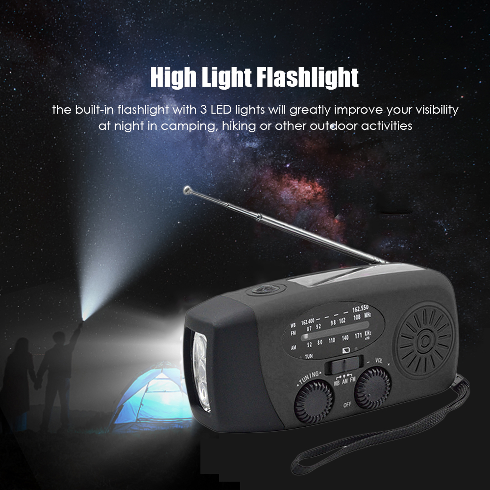 - Аварийное радио обеспечивает безопасность вашей семьи: для радио AM/FM/NOAA -это без проблем, чтобы выслушать важные погодные обновления или другие сообщения, это действительно спасатель, чтобы следить за ураганом, Торнадо, Штормом, Огненной и другой погодой тревоги. Он может быть основан на солнечной энергии, зарядке USB и ручным руководителем для ручного производства энергии.