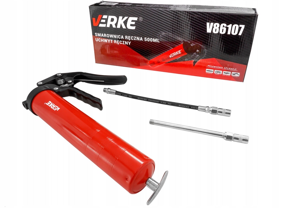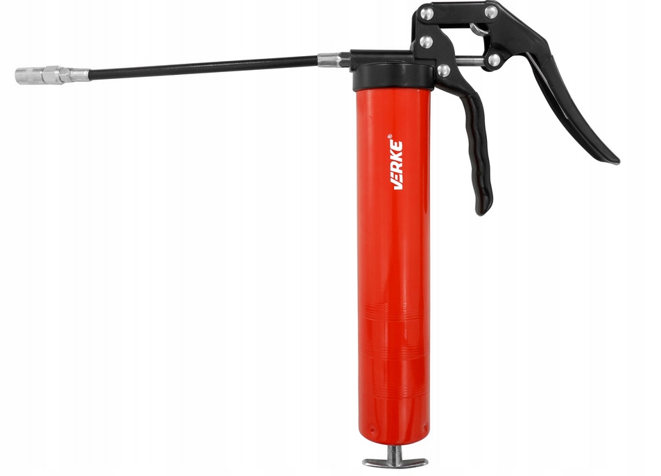 Смазочный шприц марки VERKE представляет собой устройство, используемое для смазки под давлением механических элементов, таких как валы, штифты, подшипники, шарниры. Он изготовлен из стального цилиндра емкостью 500 мл, в котором действует поршень с ручным приводом. Поршень изготовлен из высококачественной резины, устойчивой к длительному воздействию жиров и масел. В комплект входят две жесткие и гибкие насадки, подходящие для стандартных насадок.