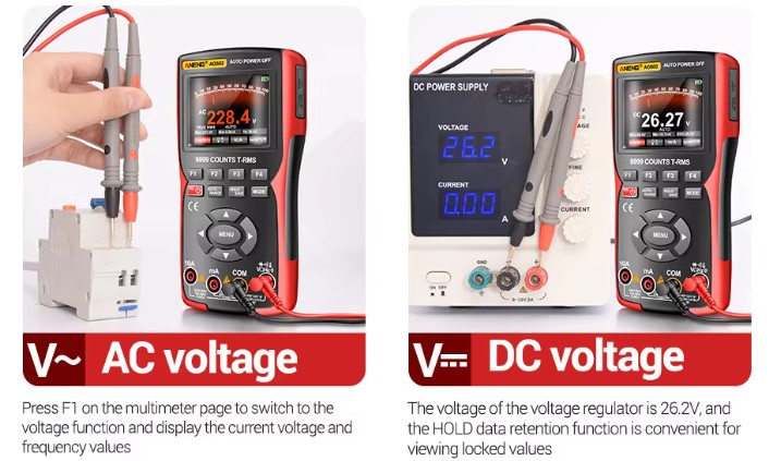 - Автоматический/Ручной Диапазон счета 9999True-RMSМультиметр можно использовать для измерения-переменного/постоянного напряжения, а также тока, сопротивления и емкости. , частота, температура, проверка целостности и диодов .