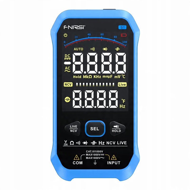 Параметры продукта. Название продукта: Умный мультиметр с большим цифровым экраном Номер продукта: ФНИРСИ-С1 Максимальный диапазон: 9999 Уровень безопасности: CAT III 1000 В. Напряжение переменного тока: 1000 В Напряжение постоянного тока: 1000 В Сопротивление: 100 МОм Температура: 1000 ℃ Емкость: 10мФ Частота: 10 МГц Светодиод: √ Подсветка ЖК-дисплея: √ Автовыключение: 15 мин. Функция освещения: √ Звуковой сигнал вкл/выкл:√ Автоматический диапазон:√ Напряжение обнаружения NCV: √ Живой режим: √ Вес нетто продукта: 135 г Материал: АБС Размер продукта: 143 мм*75 мм*19 мм Пакет и список. Мультиметр * 1 Датчик температуры * 1 USB-кабель для зарядки * 1 Ручка измерителя * 1 Руководство пользователя *1