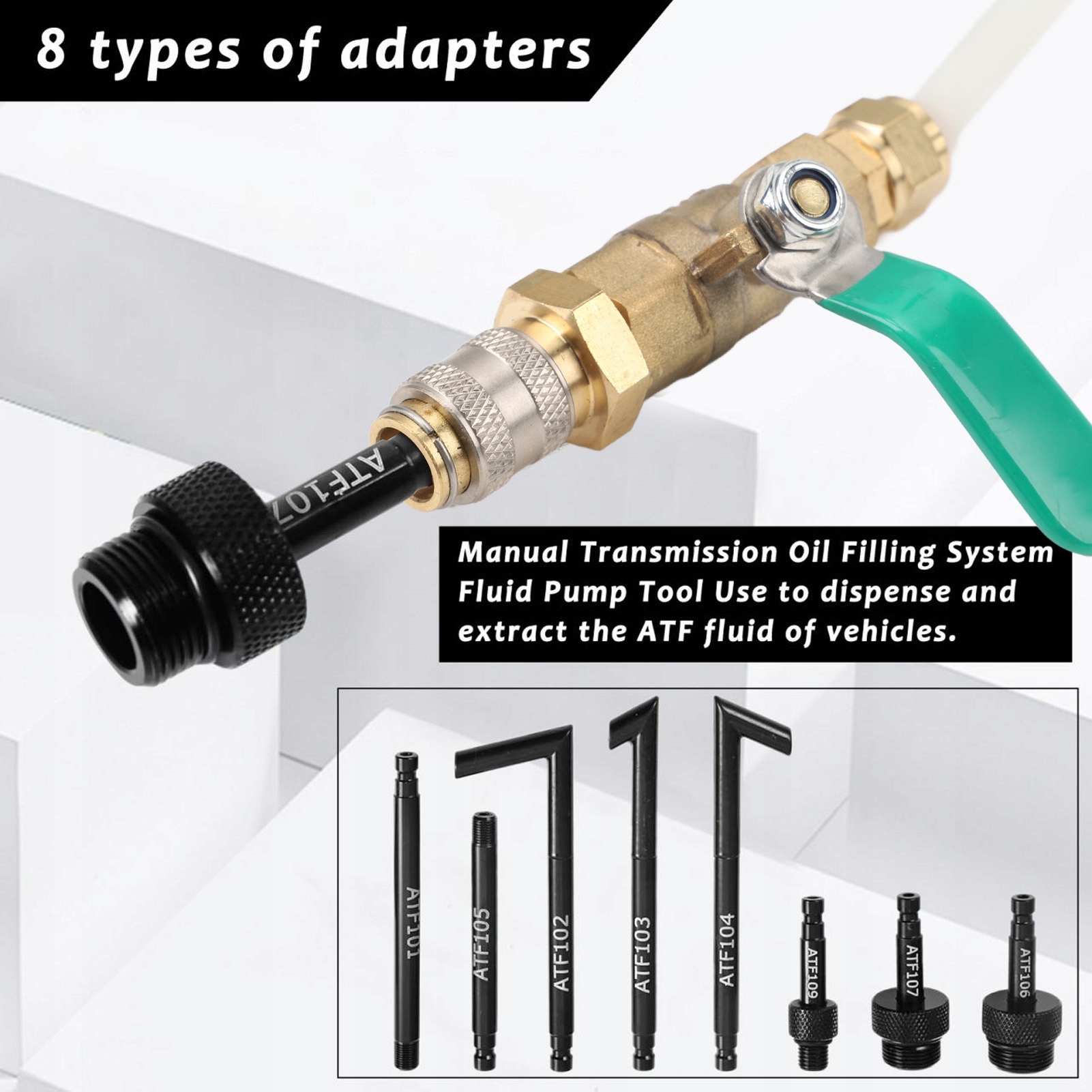 5. НЕСКОЛЬКО АДАПТЕРОВ ДЛЯ ПРЕОБРАЗОВАНИЯ ATF: Оснащен 8 переходниками для преобразования ATF для разных моделей автомобилей, что обеспечивает совместимость и эффективность в процессе извлечения масла.
