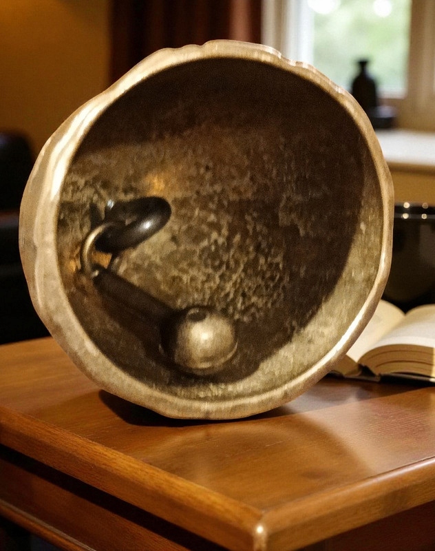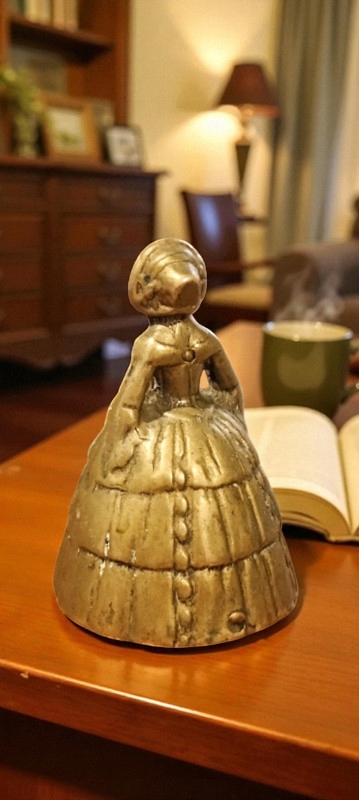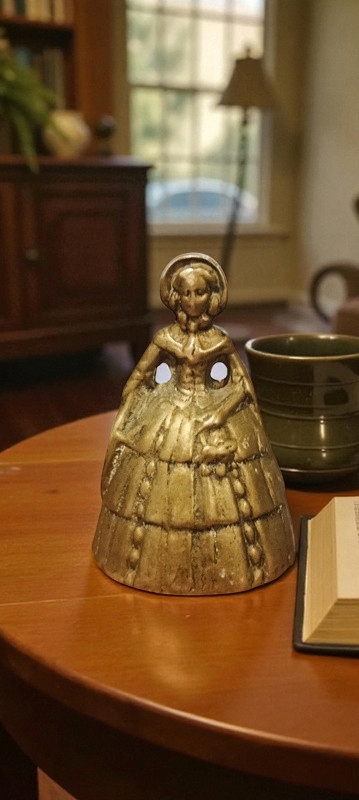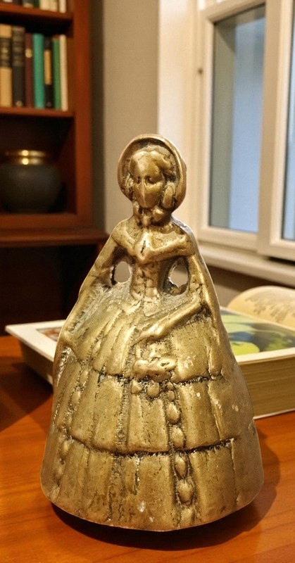 Колокольчик, как в старину, возвещал о начале и окончании перерыва. Незаменимый атрибут хорошего дворника. Этот меньше по размеру и имеет другую форму. На нем изображена дворянка, а часть платья имеет колокольчик. Изготовлен из латуни - очень хорошее состояние.