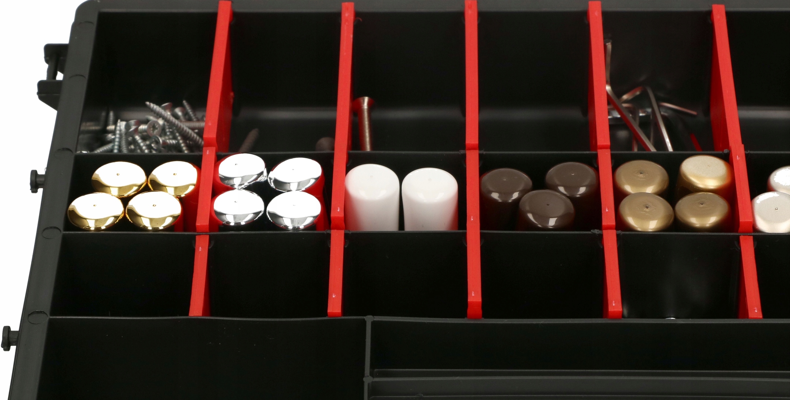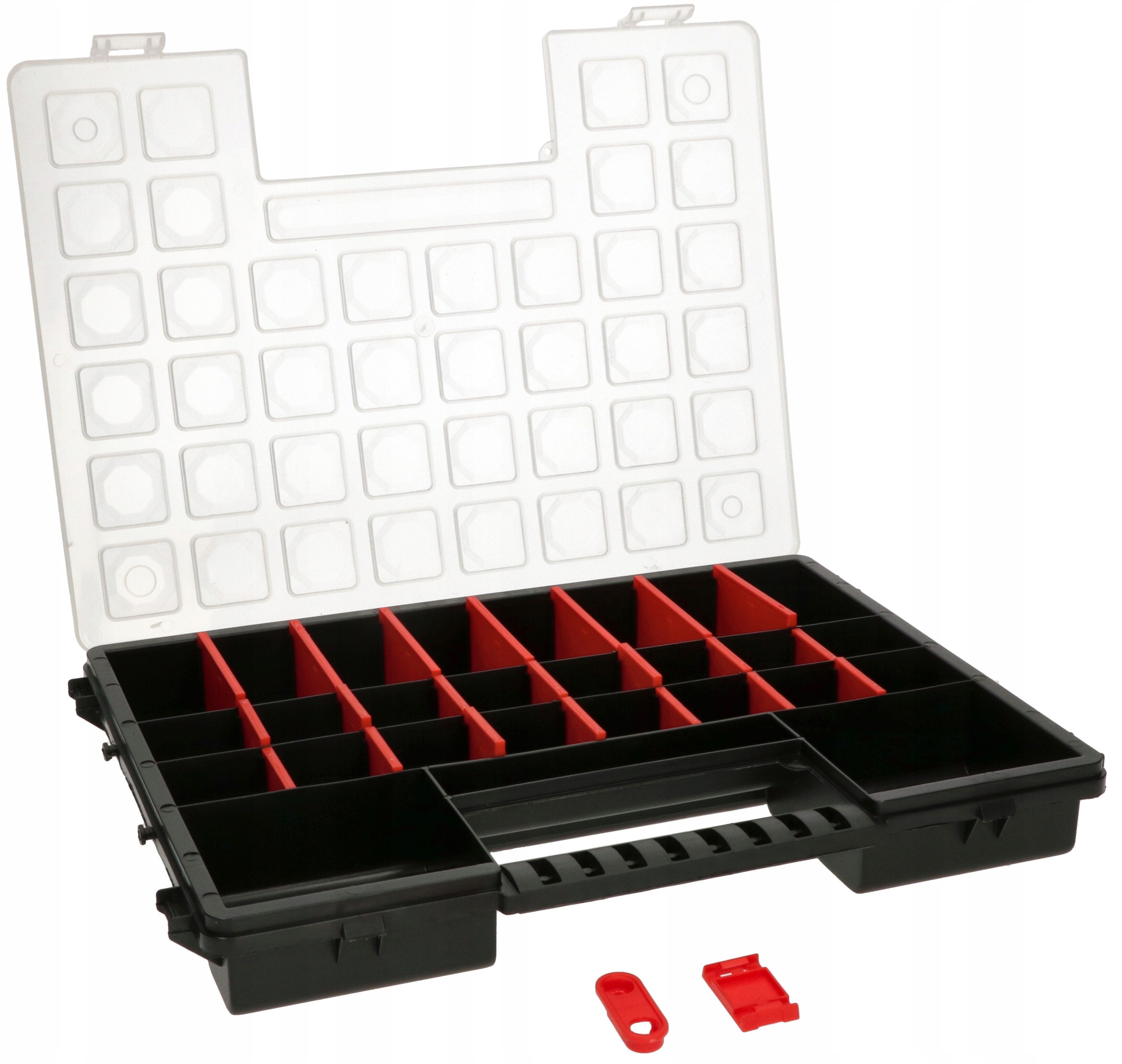 - После установки всех отделений (7 больших и 14 маленьких) органайзер имеет 27 ячеек — 2 больших, 8 средних, 16 маленьких и 1 самую маленькую (узкую и длинную).