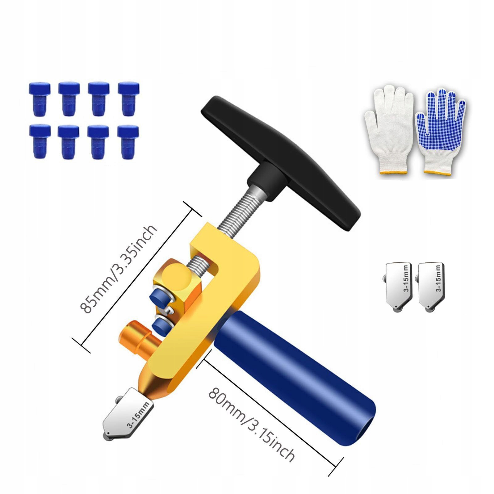 - Состоит из стеклореза и плоскогубцев для разбития плитки, он может резать и разбивать стеклянную или керамическую плитку толщиной 3–15 мм (0,12–0,59 дюйма).