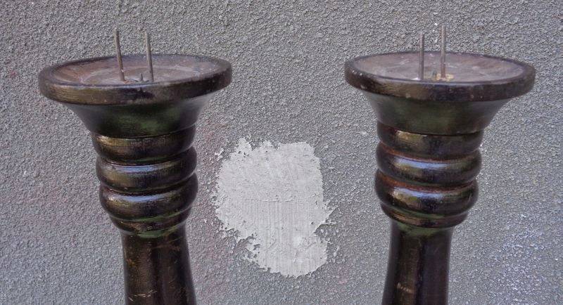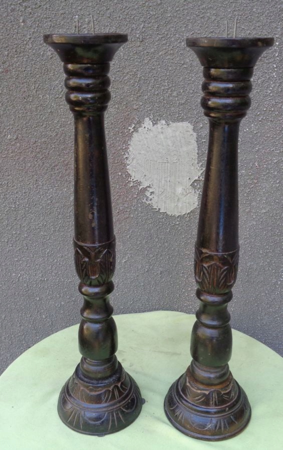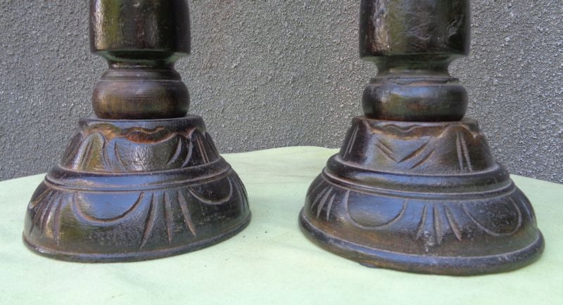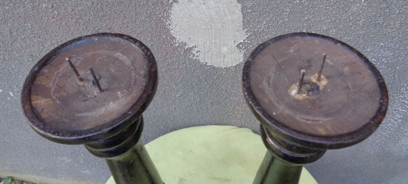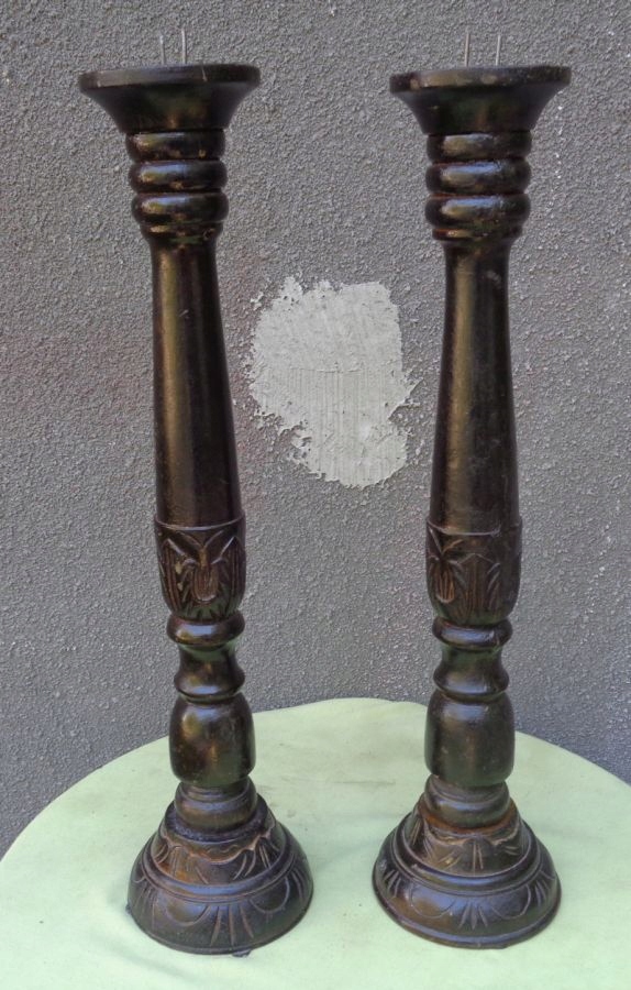 интересные, интересные деревянные свечи с 1900-1920. Экспонаты вручную, богато вырезаны. Основание подсвечников была точно и полностью украшена вручную. Он украшен интересными различными украшениями. Над основанием существует интересная разнообразная профилированная поверхность. Средняя часть украшена интересными ручными резными украшениями. Вверху имеет интересное складывание в дереве. На вершине подсвечника есть интересные три выпуклости. Пик подсвечника имеет интересную форму чашки. Экспонаты были изначально окрашены. Основы подсвечников для стеблей привинчены деревянной нитью. Одна из нитей была сломана, которая была представлена на фотографиях. Я рекомендую это для всех.