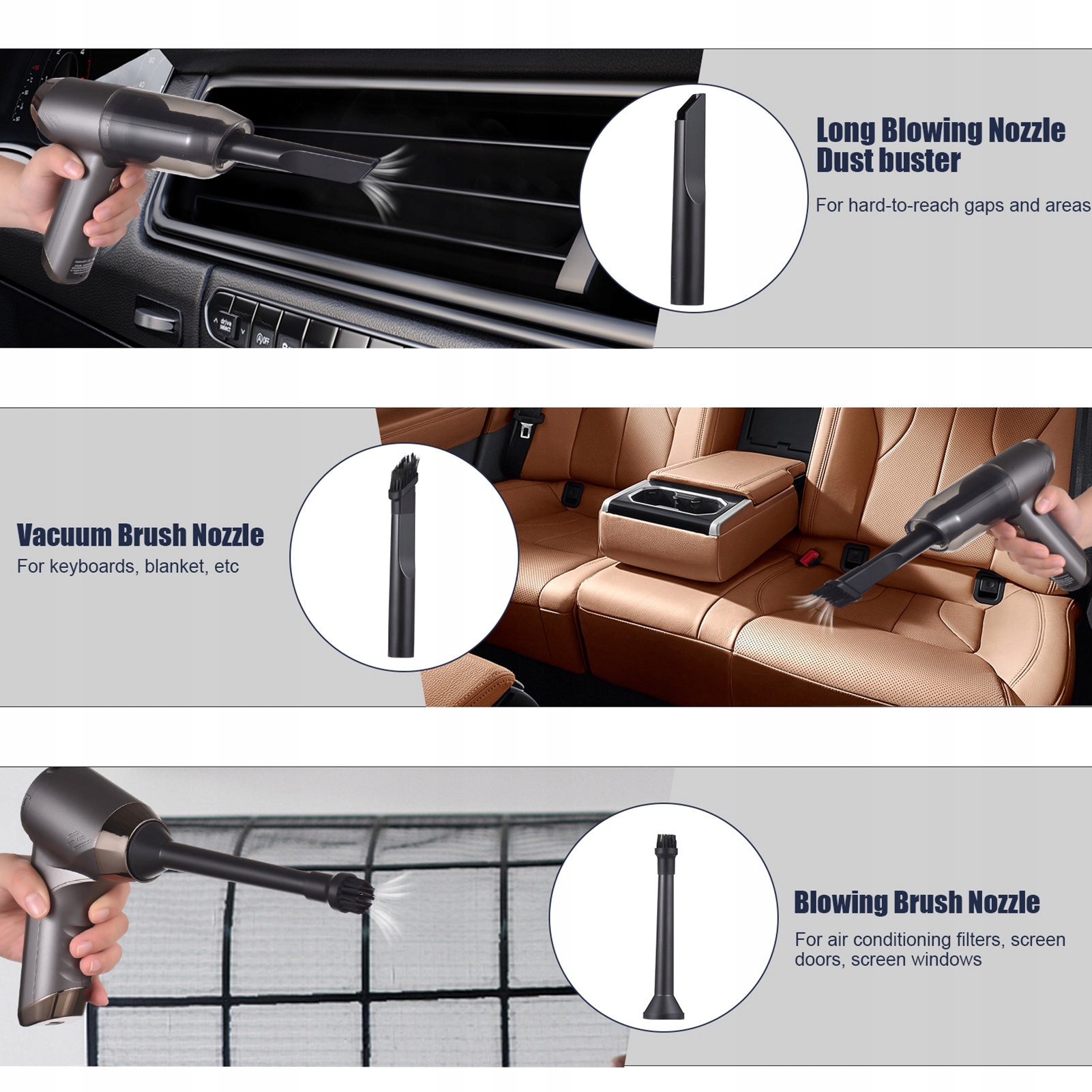 1. Функции 3-w 1: портативная вакуум \ u0027s. Бесстраночный двигатель обеспечивает твердую мощность всасывания 95000r/ мин 19000pa и сопровождает 7 различных сопласа. С другой стороны, есть воздуходувка, которая эффективно устраняет пыль из линз камеры и пианино. После прикрепления сопла первой страницы также можно использовать в качестве вакуумного насоса для дефлерации мешков для хранения дома. Точно так же, после того, как оборудование из сопла задней стороны можно использовать в качестве ручного насоса для надувания спасательных жилетов и плавательных колец.