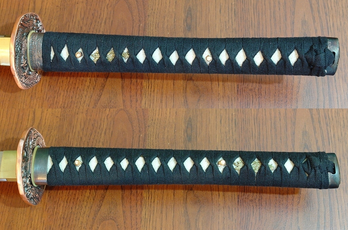 - деревянная рукоять (цука), обтянутая натуральной кожей ската (самэ-гава), черная хлопчатобумажная тесьма, туго натянутая.