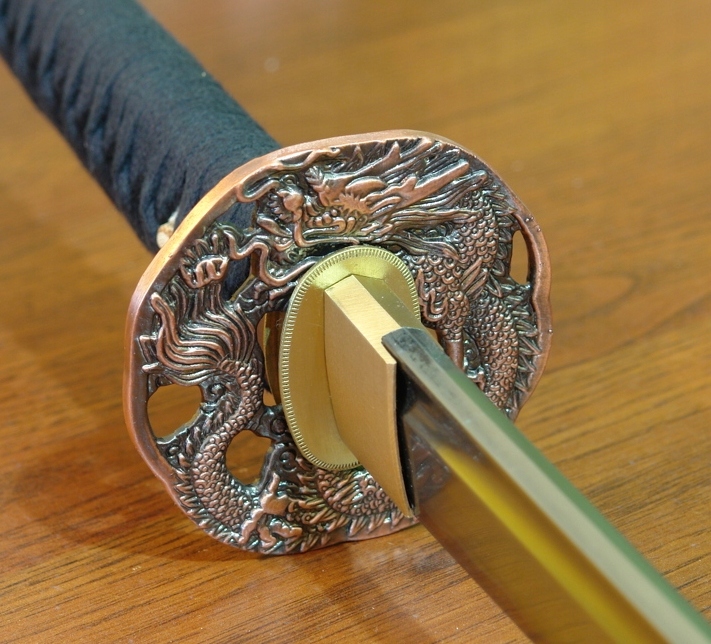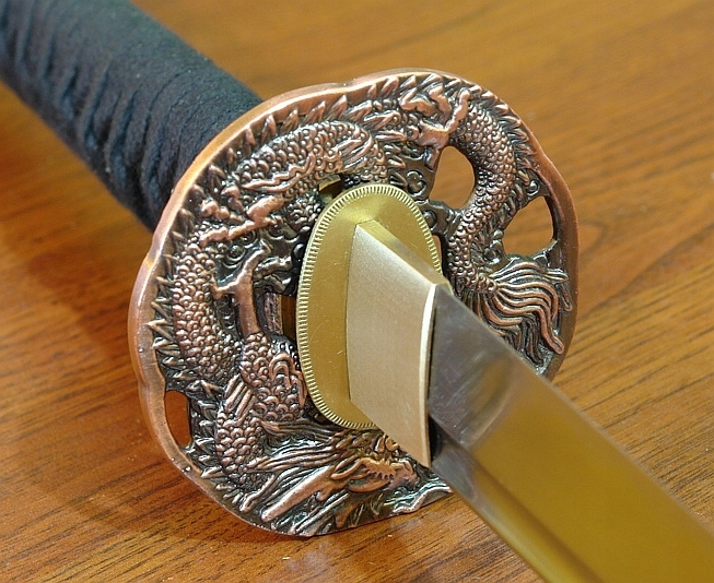 - Наперед (хабаки), цуба (гарда) с мотивом дракона, две менуки и шайбы (сеппа) из латунного сплава - как на фото.