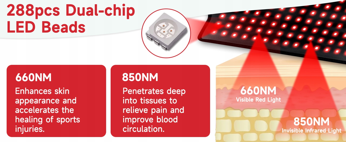 ✅dal-chip светодиодные шарики: наш ремень шеи на плече к терапии с красным светом содержит 288 улучшенных двухпатных светодиодных шариков. Красный свет 660 нм (видимый) улучшает появление кожи и ускоряет заживление спортивных травм, в то время как свет, близкий к инфракрасным 850 нм (невидимый), проникает в ткани, чтобы облегчить боль и улучшить кровообращение.