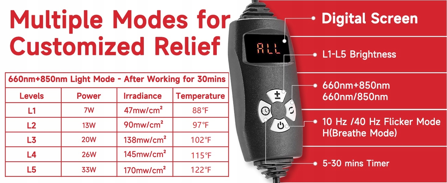✅ Очистки режимов для адаптированного рельефа: выберите один из четырех режимов: красный свет 660 нм, свет близко к 660 нм + 850 нм. Каждый режим предлагает 5 регулируемых уровней яркости для оптимальной эффективности. Идеально подходит для спортивных травм, жесткой шеи и рук, болей в спине, болезненности мышц и восстановления тканей.
