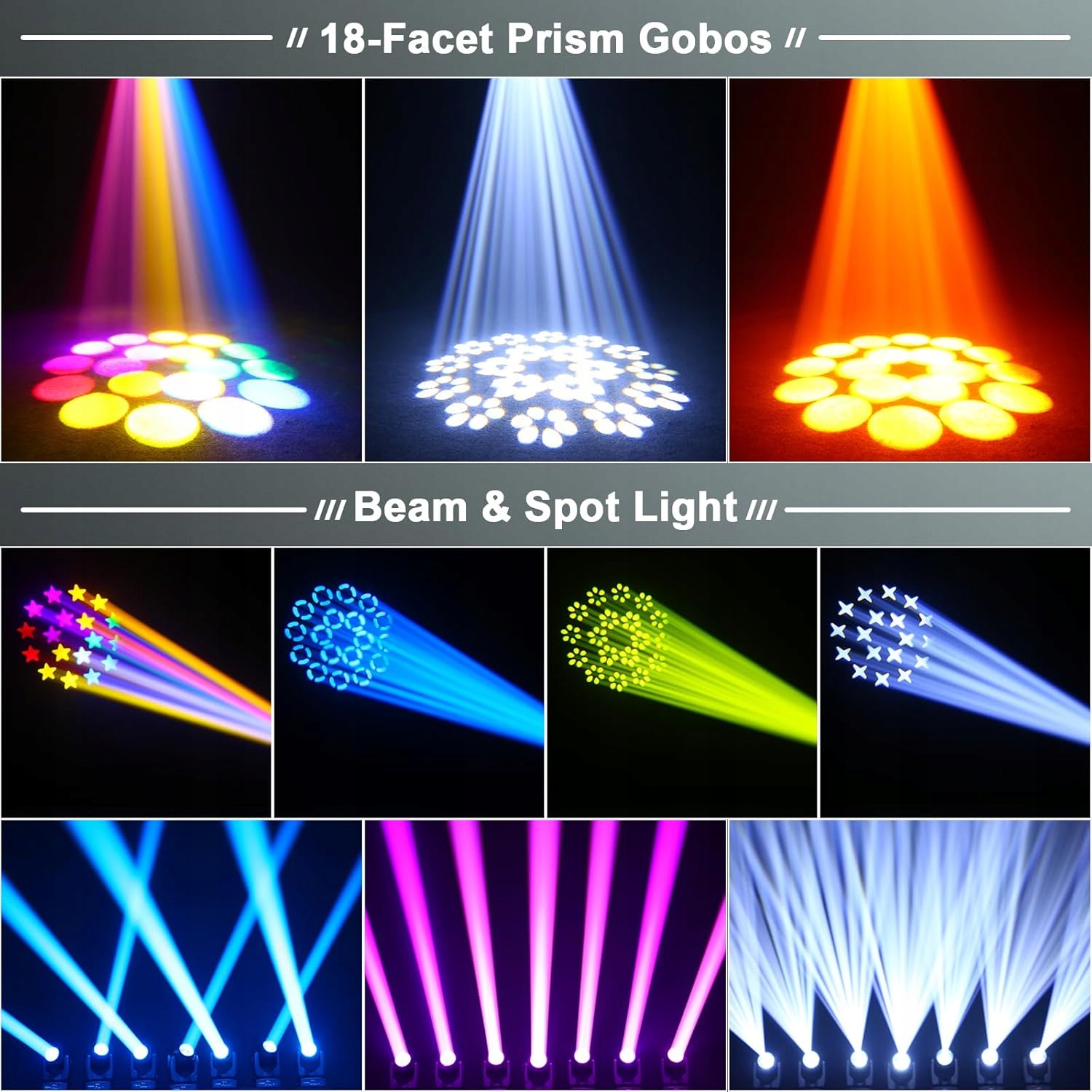 • 5 режимов световых эффектов: луч, узор (гобо), призматический свет, стробоскоп, затемнение