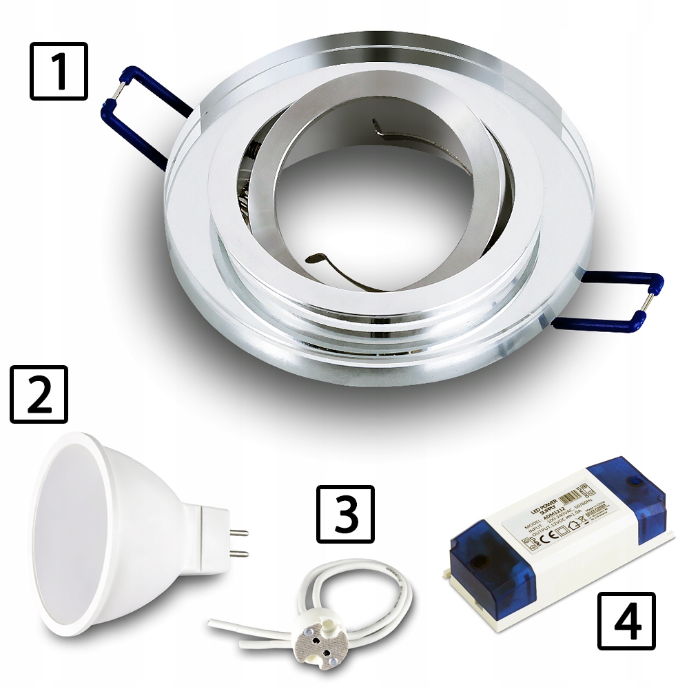 Чтобы получить полный комплект освещения, необходимо приобрести лампочку GU10 и патрон для лампочки (версия 230В) или лампочка Gu5.3, патрон для лампы и блок питания светодиодов (версия 12В). Ниже мы представляем, как должен выглядеть такой набор.