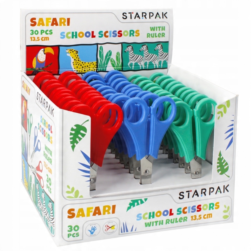 Ножницы STARPAK – это качество, функциональность и безопасность. Высококачественная сталь, закругленные концы, печатная линейка. Благодаря этому ваш ребенок сможет безопасно пользоваться нашими ножницами на уроках и дома.