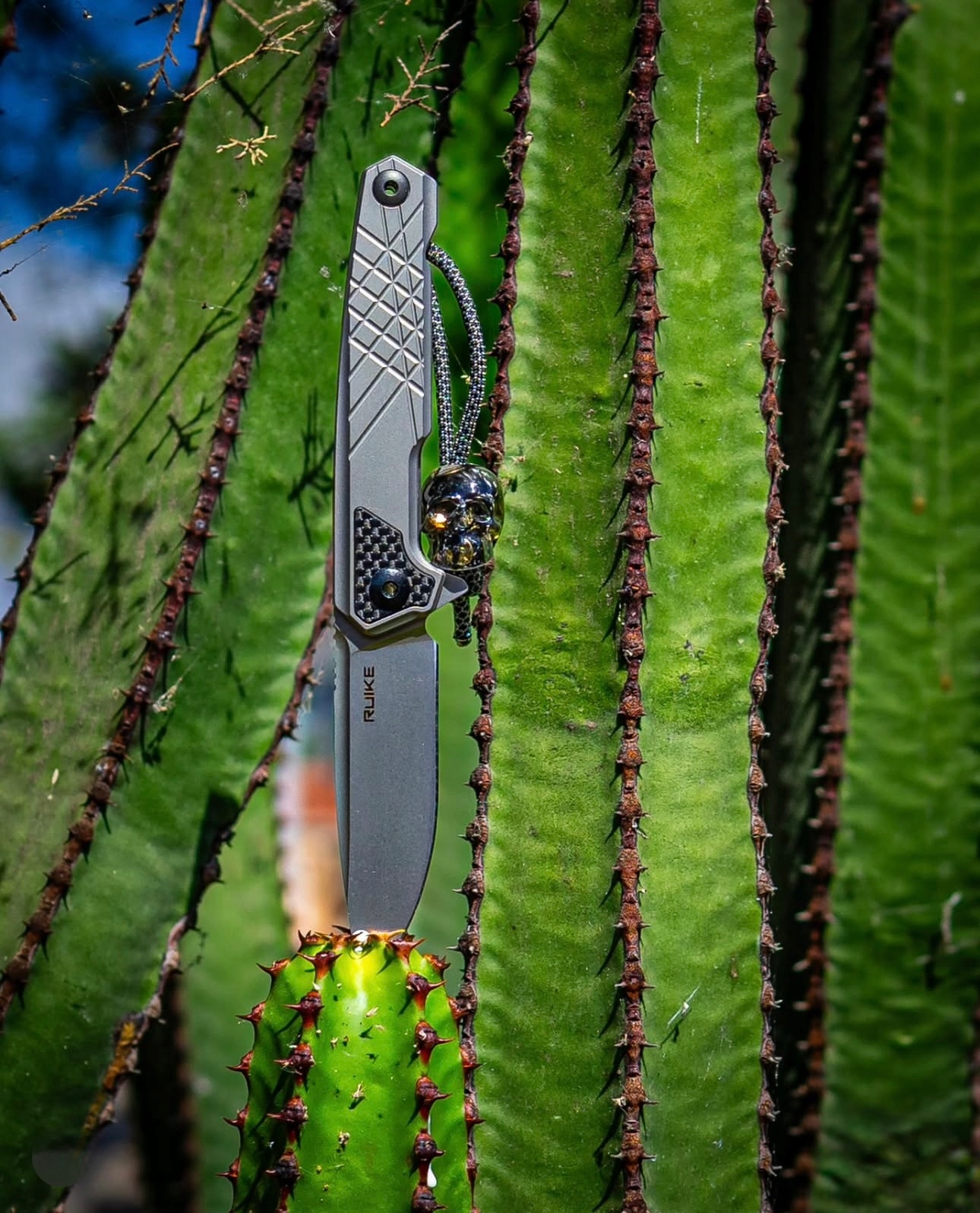 Нож связан с использованием титановой оболочки , украшенной ламинатом G10 и углеродным волокном. Краматизированные резаки на ручке придают ножу современный и роскошный вид.