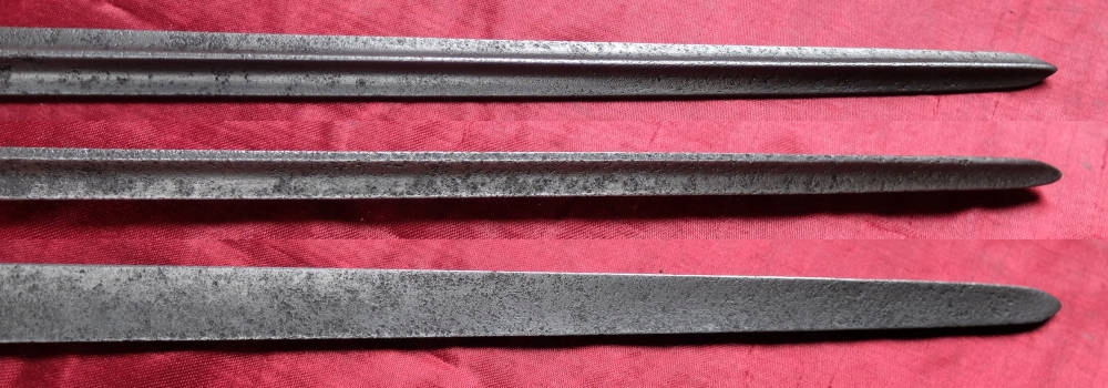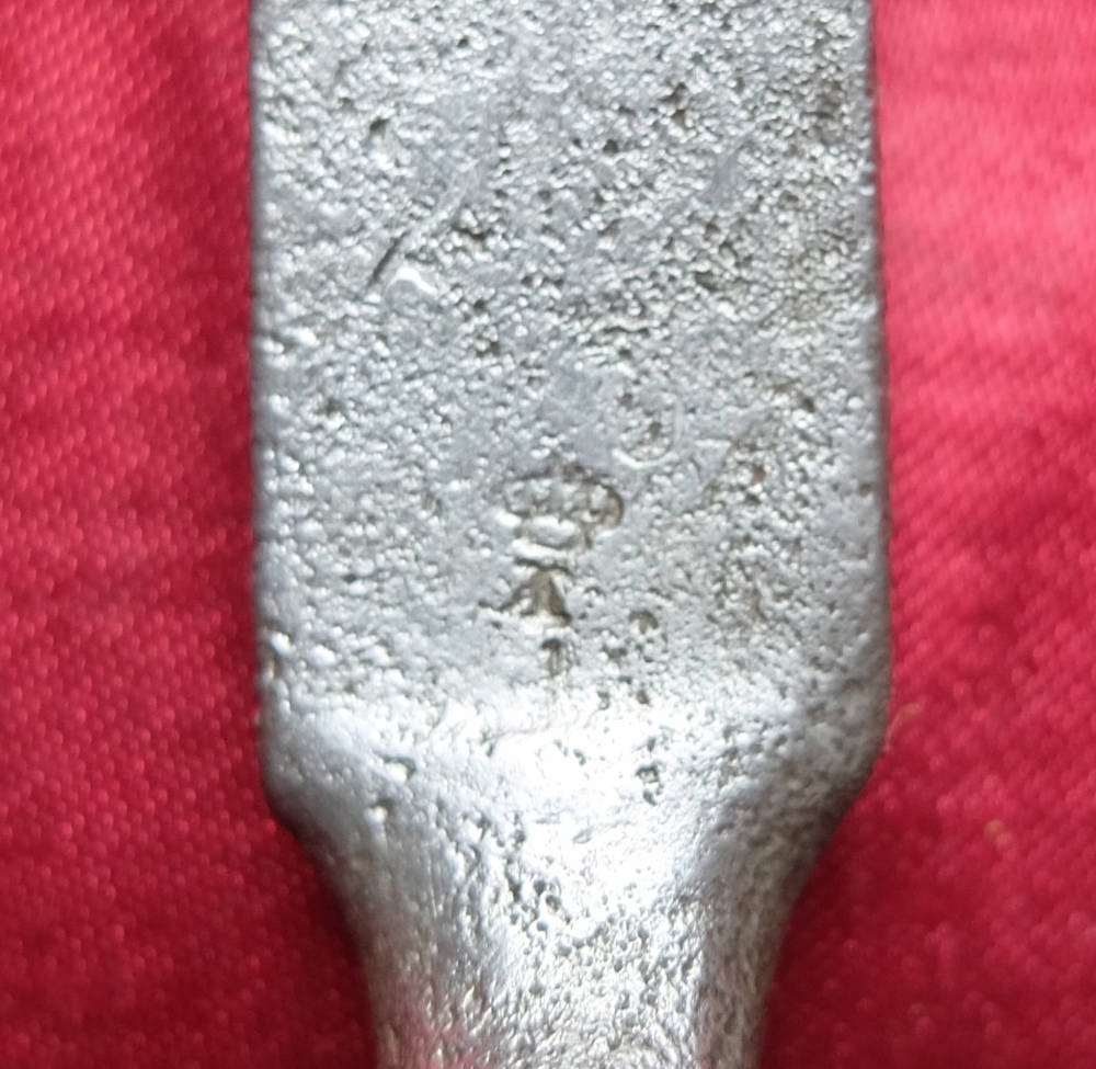 Экземпляр виден на фотографиях. Он покрыт ровной мелкой крупкой. На пороге клинка и плече видны подписи. Перемычка на втулке повреждена. Кольцо отсутствует.