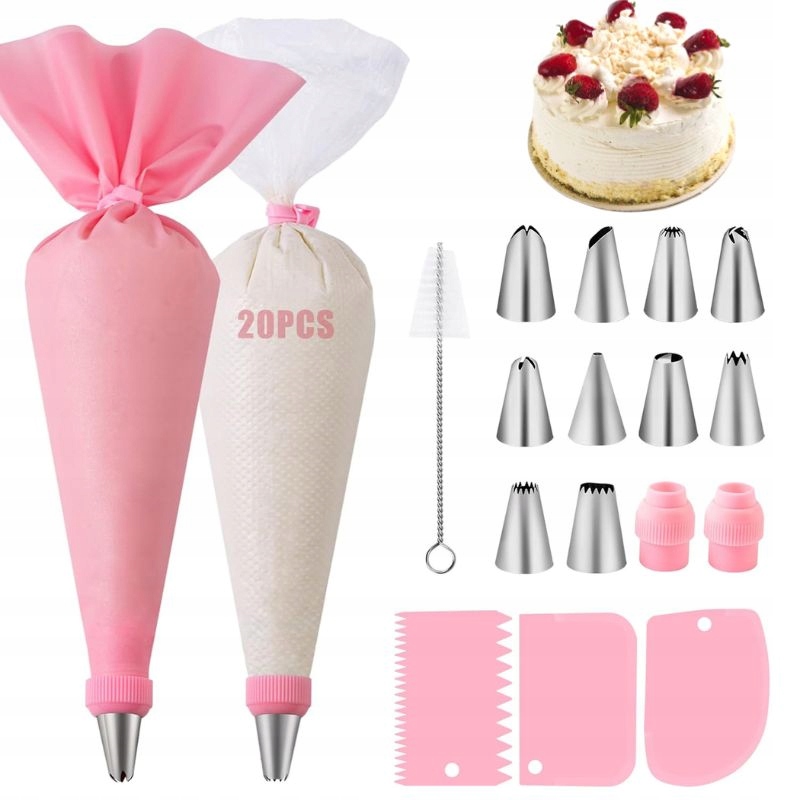 Набор содержит целых 40 элементов, которые сделают украшение выпечки стать более простым и креативным. Набор включает в себя: 10 кондитерских изделий, 20 одноразовых кондитерских рукавов, 1 силиконовый кондитерский рукав, 2 крепления для приклада, 3 скребки теста, 3 силиконовых зажима и 1 чистящая кисть. Широкий выбор инструментов позволяет точно создавать украшения и облегчить работу как для начинающих, так и для продвинутых кондитерских изделий.
