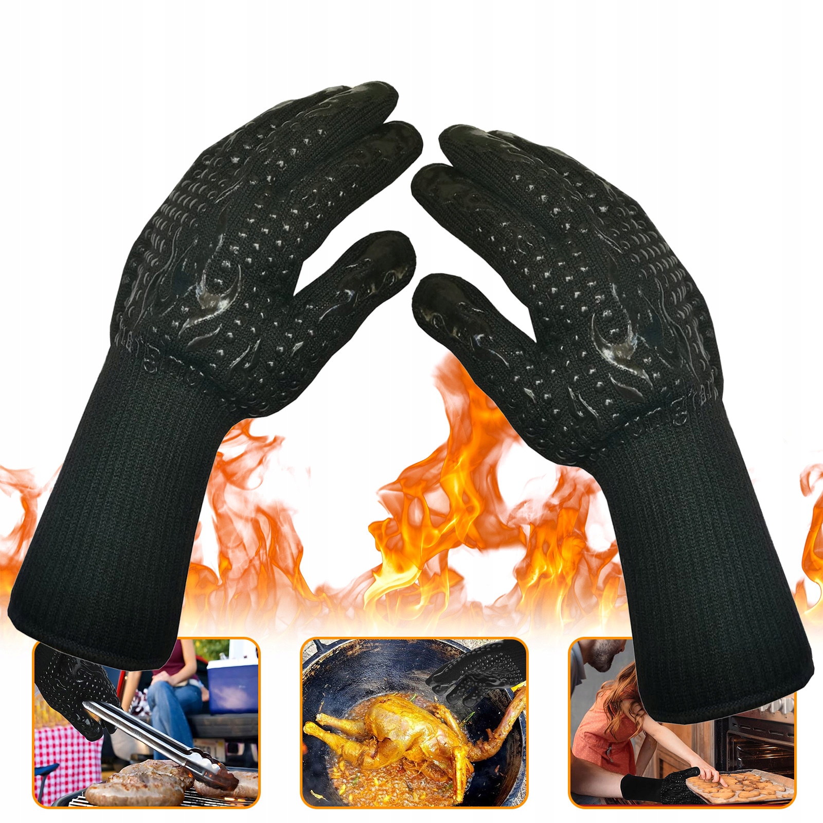 Универсальное использование: многофункциональные перчатки для гриля: эти перчатки для гриля характеризуются не только в превосходной теплостойкости, теплоизоляции и тепловых разряде, но также устойчивы к пересечению, износу и очень прочному, который работает во время гриля, выпечки и других видов деятельности, требующих высокой температуры.