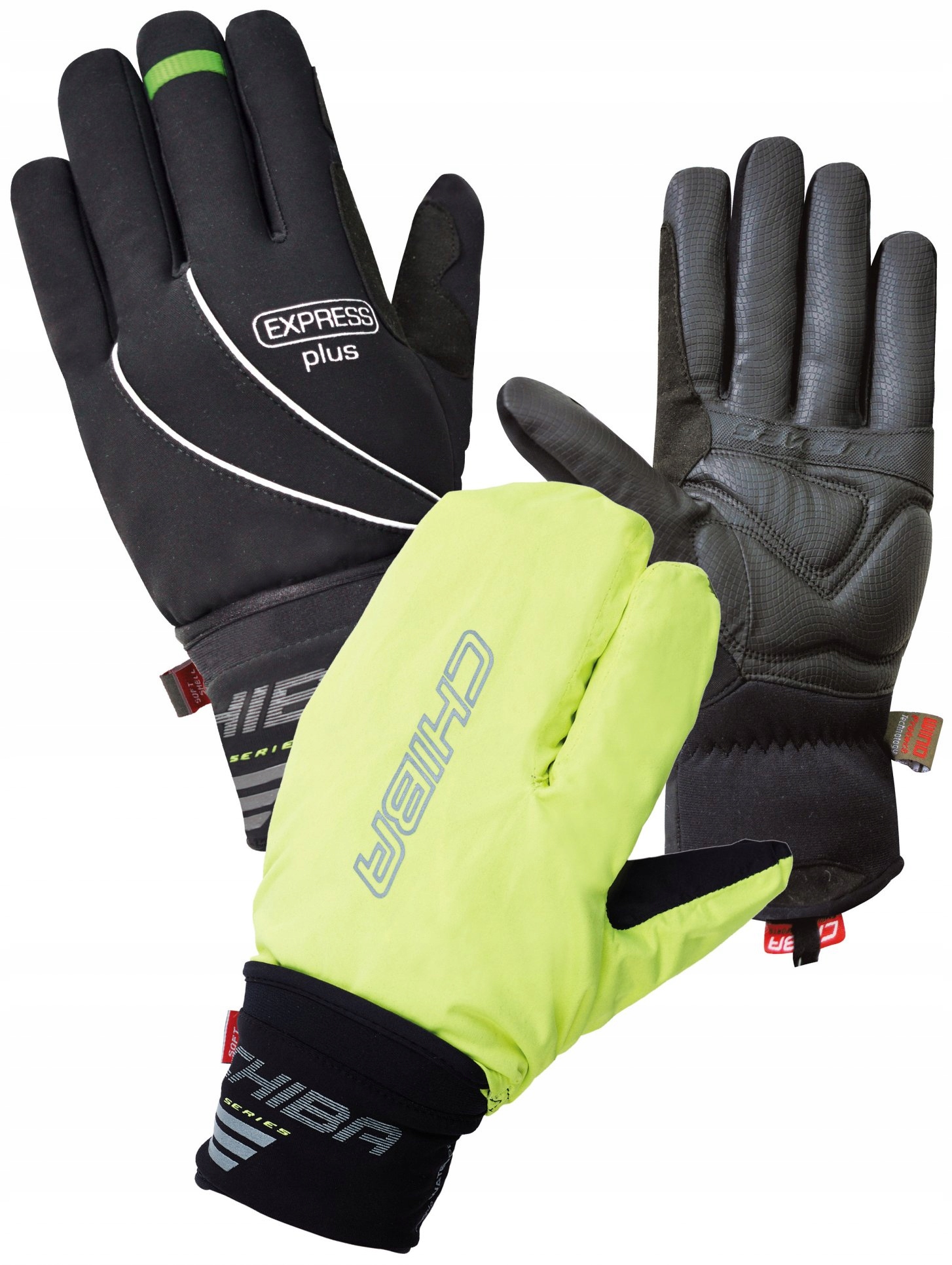 Chiba Express+ — зимние велосипедные перчатки. Предназначен для езды на велосипеде, бега и горных походов. Зимние перчатки с дополнительным слоем тонкого непромокаемого нейлона, спрятанные в небольшом кармане на тыльной стороне руки.